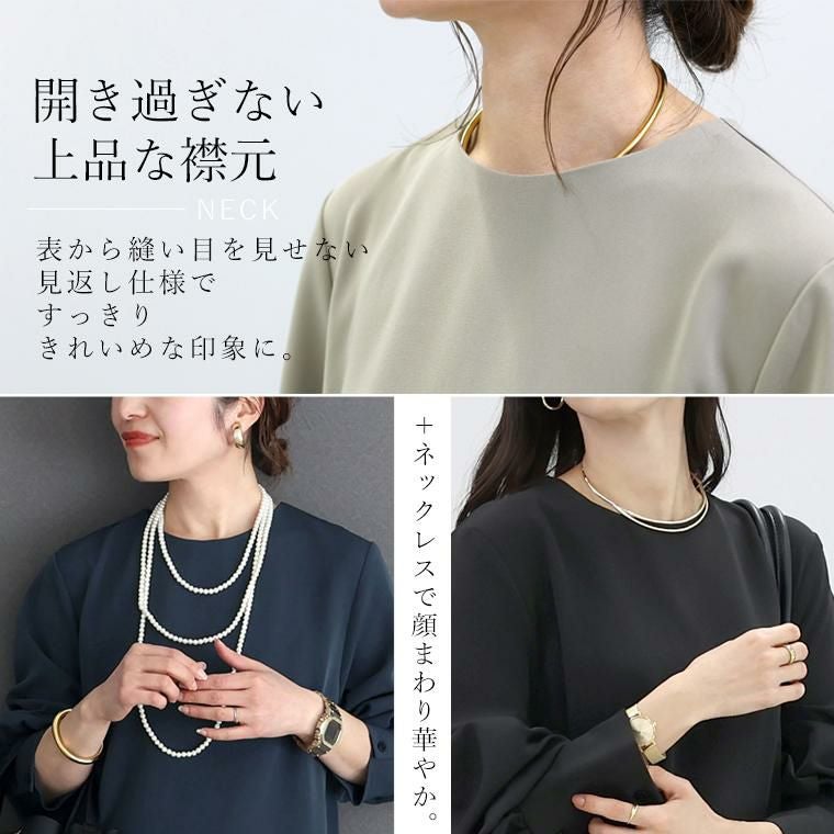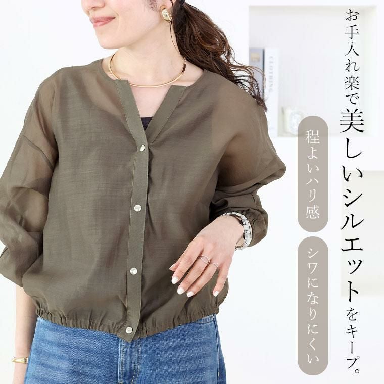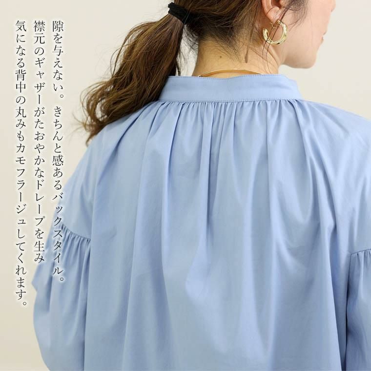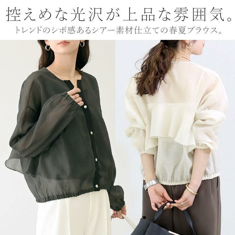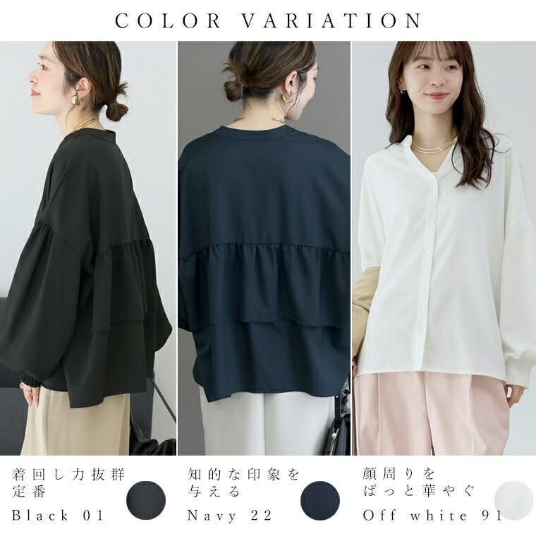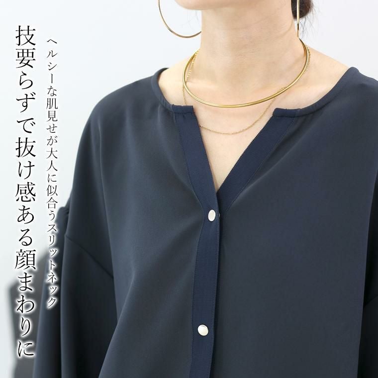 ボタンとシャーリング使いできちんと着映える2wayブラウス