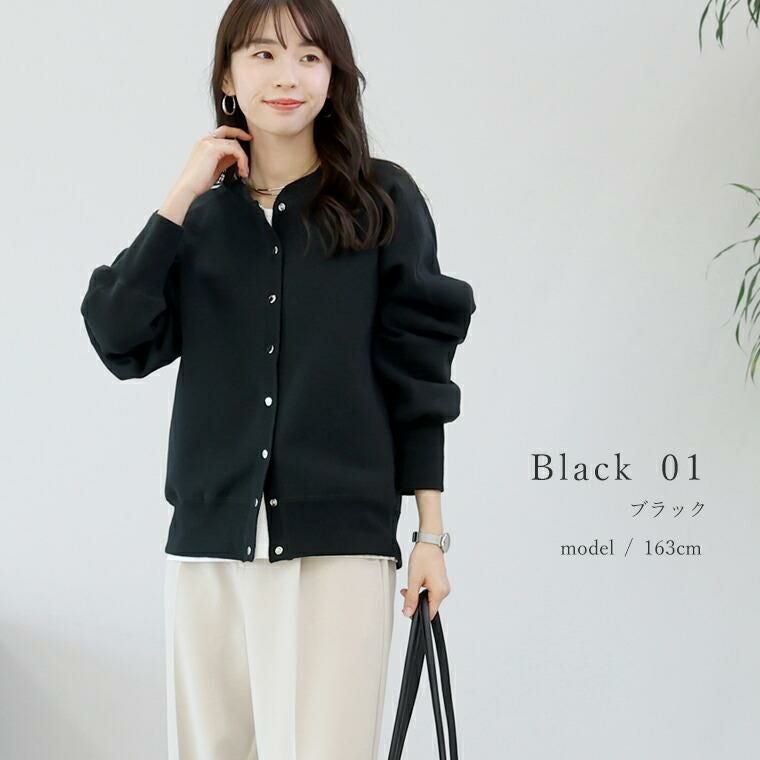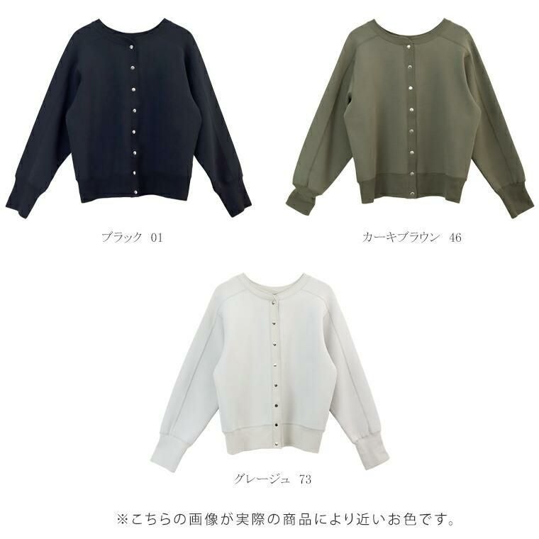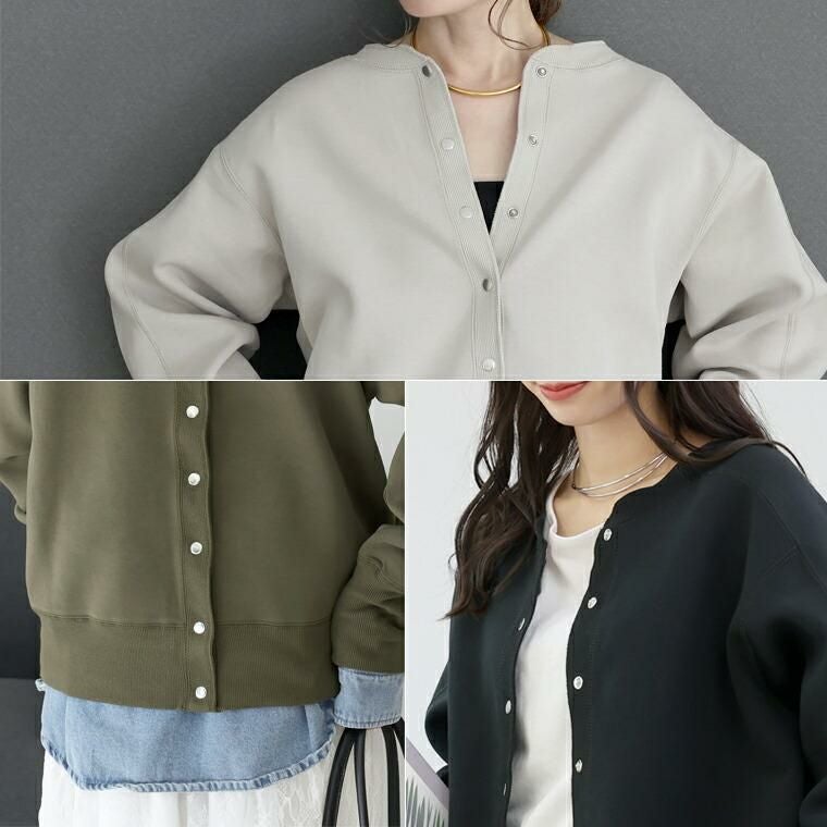 ふっくらとした弾力と伸縮性で着心地抜群、注目のダンボール生地で仕立てた2wayカーディガン。つるっとしたなめらかな表面感が上品な表情をみせ、きちんと感あるスタイルに仕上がります。前後での着用が可能な2wayデザインで着回し力も優秀。フロントボタンを開けてカーディガンとしても、閉じてプルオーバーとしても着られます。さらに後ろボタンでの着用もでき、たっぷり着こなしを楽しめます。シルバーのドットボタンもアクセント。長すぎず短すぎない絶妙な着丈は、パンツともスカートとも相性良し。インナーを変えて長い季節活躍するアイテムです。