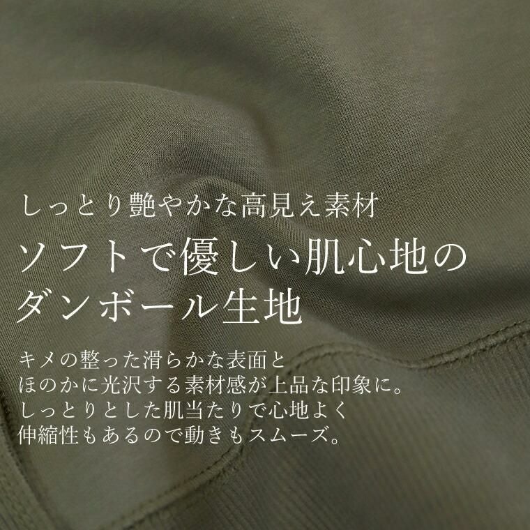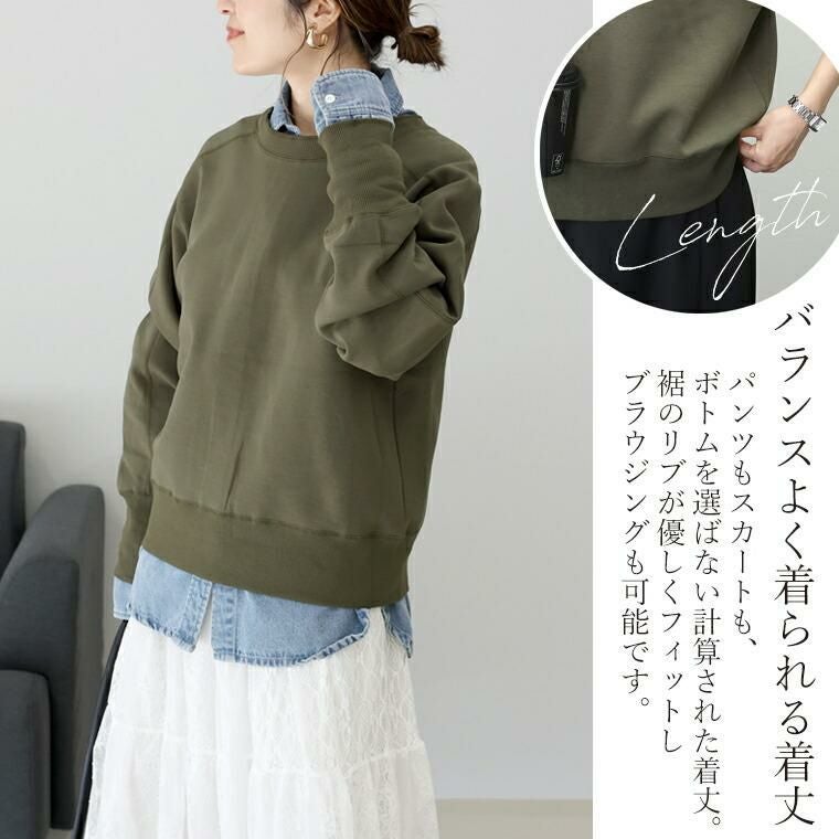 着丈はヒップが半分隠れるくらい。袖丈は手首から12cm下。しっかりした生地ですが伸縮性があり、着脱も動作も楽です。程よいゆとりがあり体のラインを拾いません。裾のリブは窮屈感なく◎。