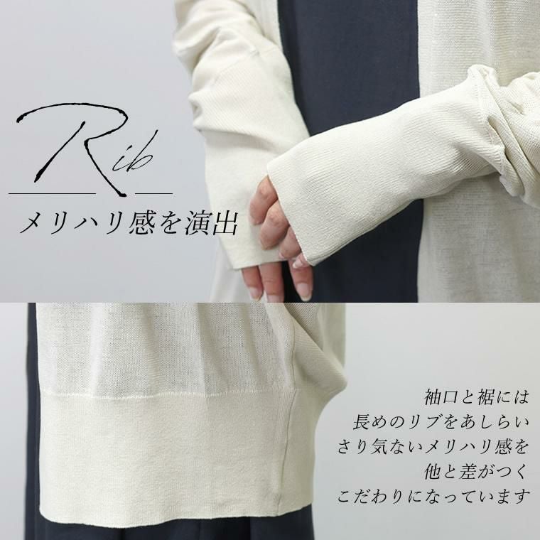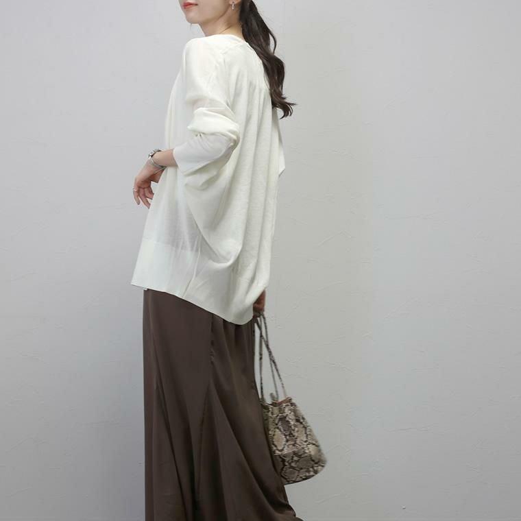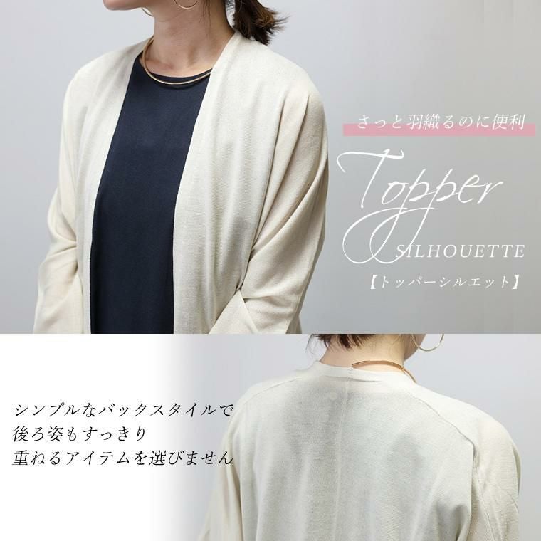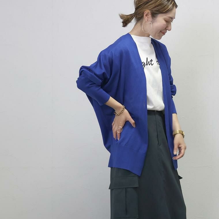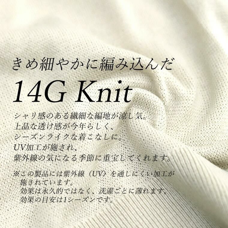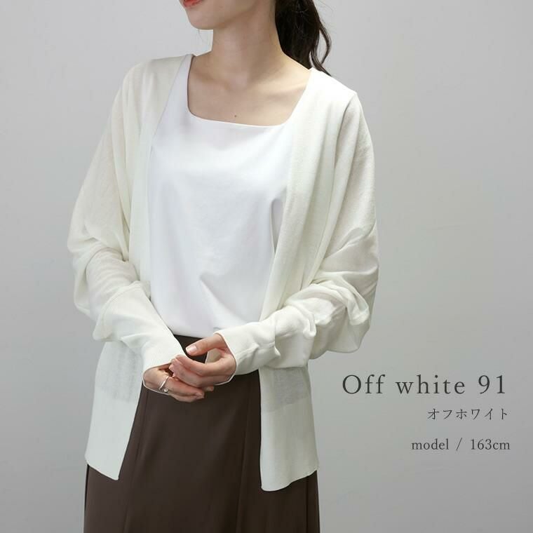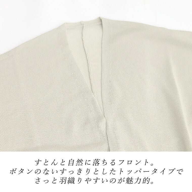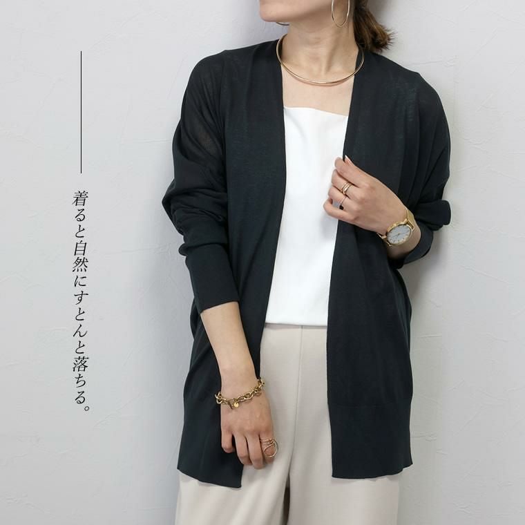 UV加工サマーニットドルマンカーディガン きめ細やかに編み込んだ14Gのニットカーディガン。 さらっとしたシャリ感のある涼し気な素材で、透け感がシーズンライクな 着こなしに。細糸ならではの上品な風合いがきれいめな印象で ジャンルレスに着まわせます。シルエットは脇繰りにゆとりを持たせたドルマン。 ゆったりとした着心地ながらも、落ち感があるので見た目はすっきり。 インに合わせるアイテムがもたつきづらいのも魅力です。UV加工を施し、 紫外線の気になる季節の外出にも重宝。日焼け対策はもちろん、 室内での冷房対策にもおすすめ。コンパクトに畳んで手軽に持ち運べます。 着回しやすいベーシックカラーからコーデの主役になる鮮やかなカラーの計4色展開です。