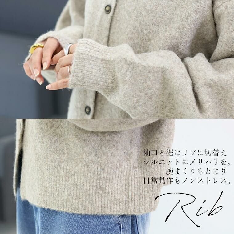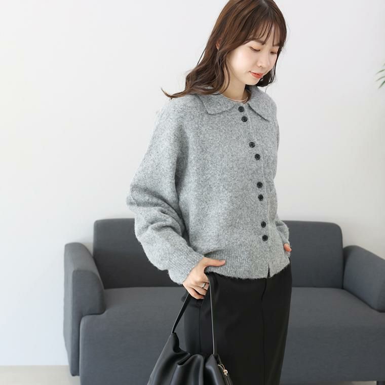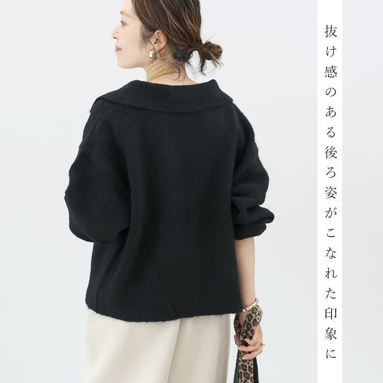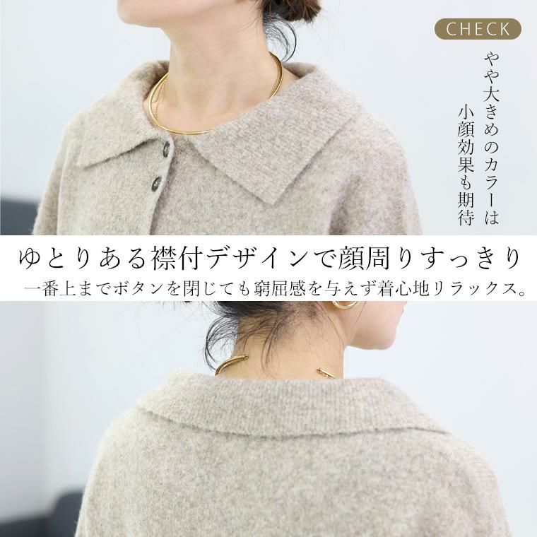 伸縮性のある起毛糸、絨毛紗を使用したデザインニット。ふんわり暖かく、肌触りの良さが特徴です。7G天竺編みのミドルゲージで、体のラインを拾いにくい。弾力のある素材&伸縮性に優れ、シルエットが崩れにくく着心地もストレスフリーです。襟付きのポロニットデザインが今年顔。やや大きめの襟は小顔効果があり、顔まわりをすっきりみせてくれます。ワイドな身幅とぽってり袖で体型をさりげなくカバーし、こなれ感をプラス。ジャストな着丈でプルオーバーにも羽織りにも活躍します。ふたつずつ並んだ水牛調のダブルボタンがアクセントとなっており、大人可愛い雰囲気に。