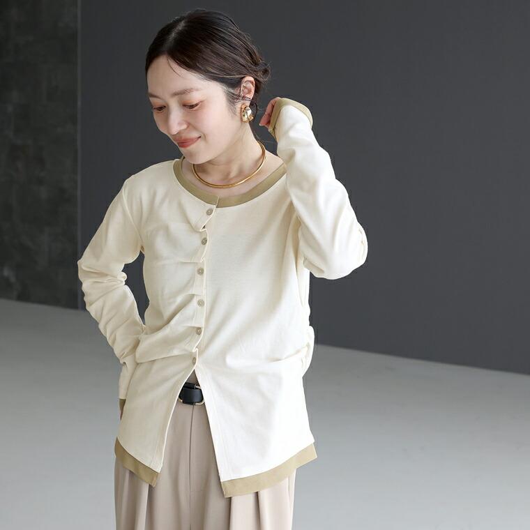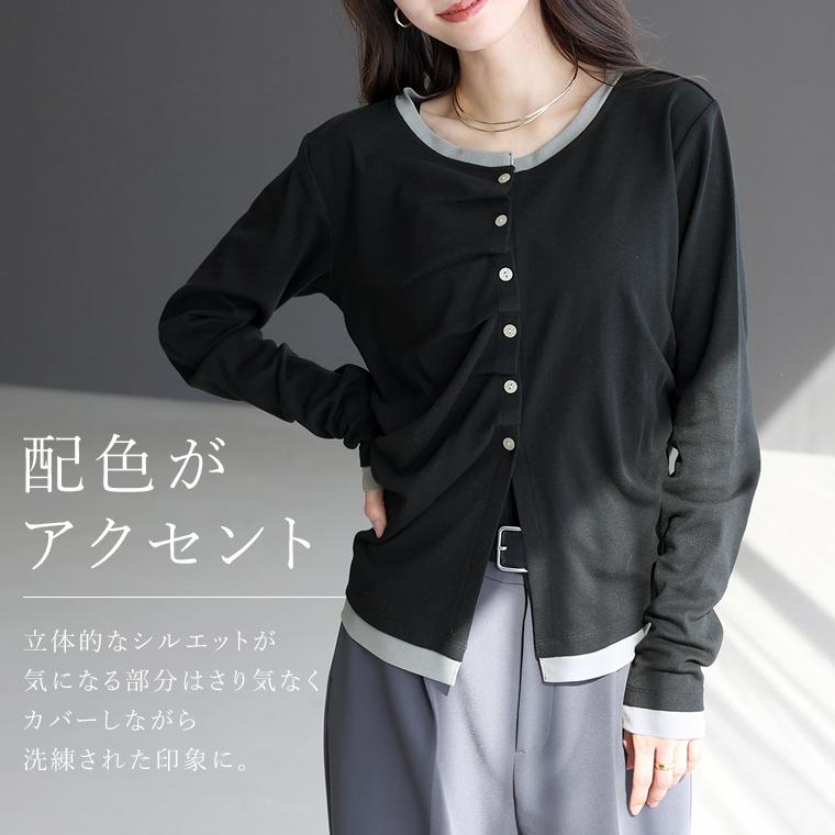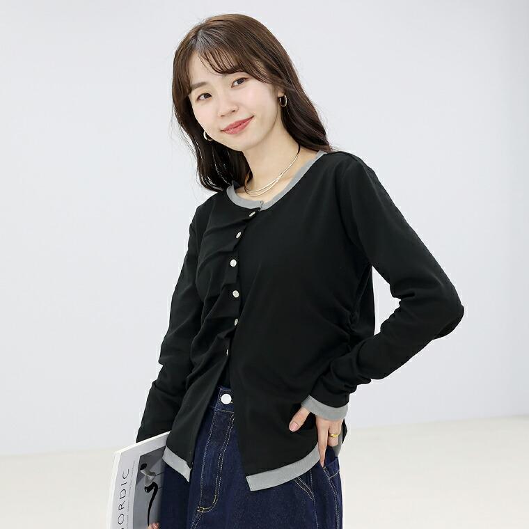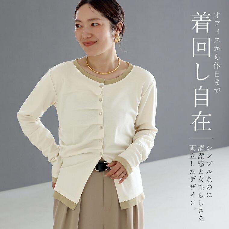配色のアクセントと立体的なシルエットが、気になる部分はさりげなくカバーしながら洗練された印象に。さらりとしたフライスの身生地に配色と立体感で華やかさが加わったカーディガン。伸縮性に優れ着心地が楽、程よい厚みで身体のラインを拾いにくいのも嬉しい。襟・裾・袖口の配色メッシュでさりげない華やぎとトレンド感をアピール。ボタンホール側のタックで立体感をプラス、体のラインをカモフラージュします。アシンメトリーデザインで洒落感アップ。両サイドゴムシャーリングでウエストを曖昧にし、後ろ姿にも自然なドレープが生まれ、背中の丸みをやさしくカバー。ボタンがウエスト位置までのスリット仕様で着るだけで脚長バランスに整います。オフィスから休日まで着回し自在。シンプルなのに清潔感と女性らしさを両立したデザイン。ラクな着心地なのに品よく決まる、大人のためのカーディガンです。