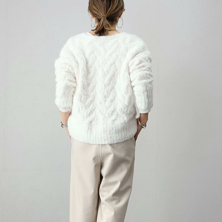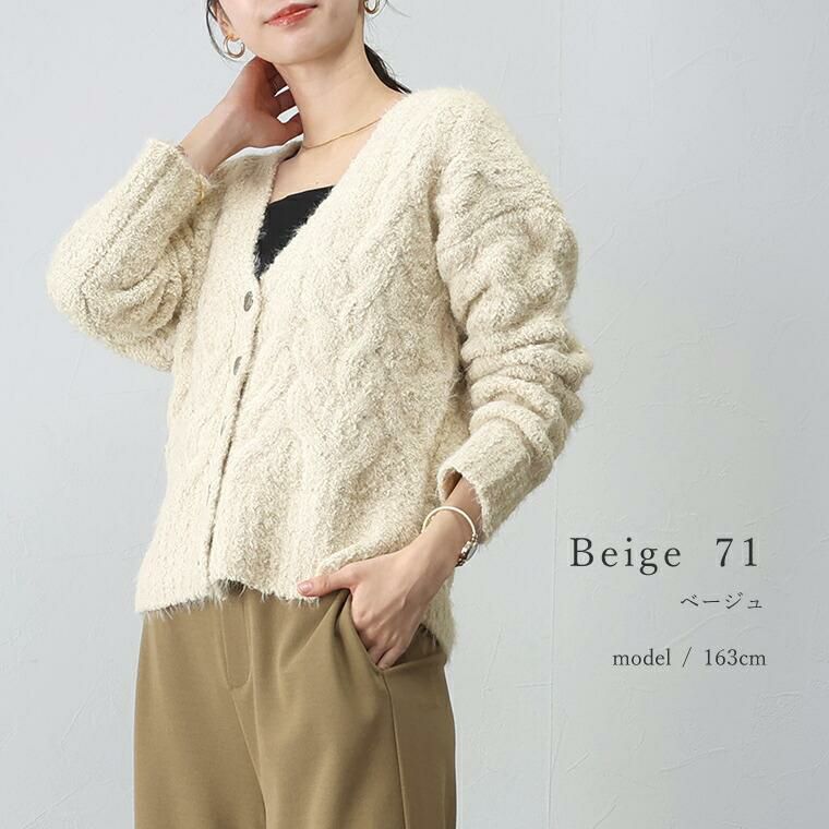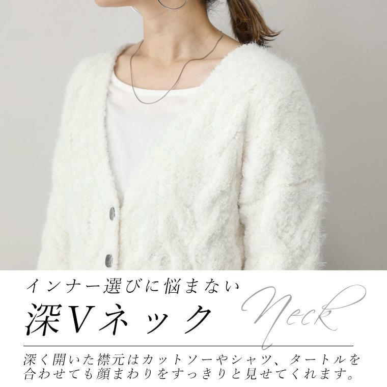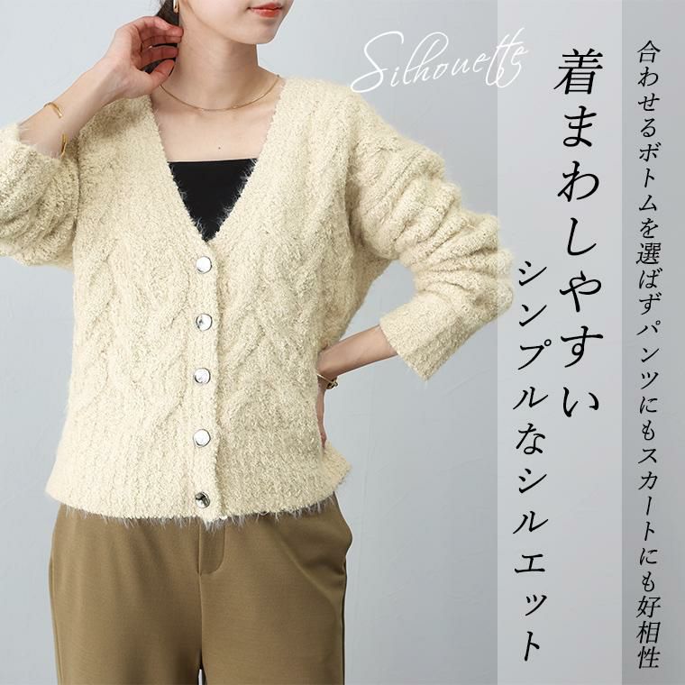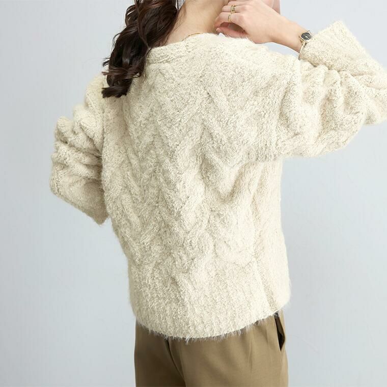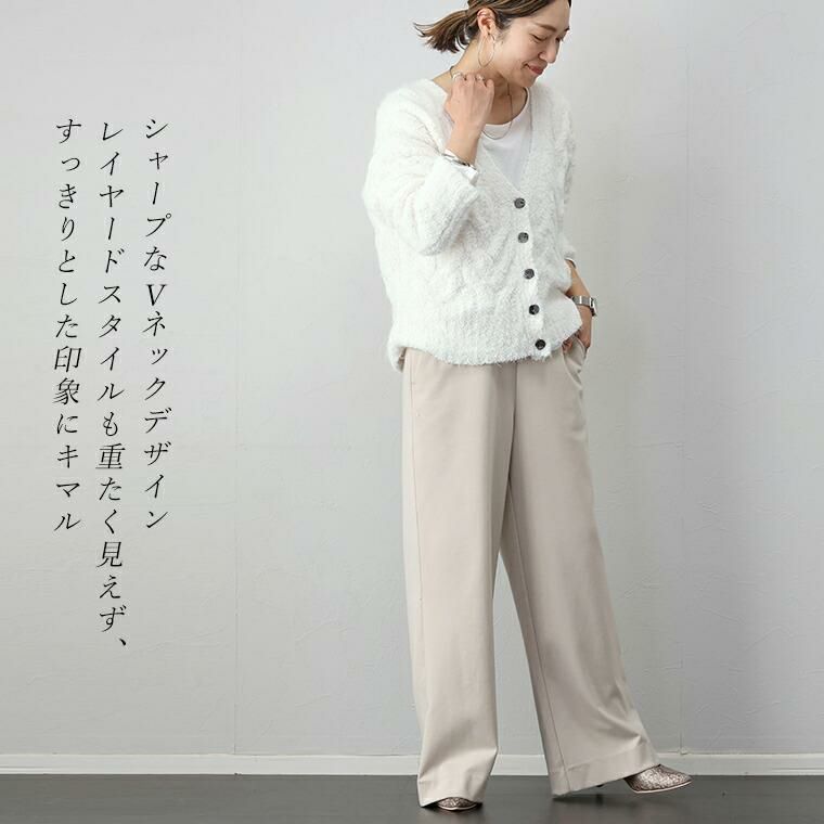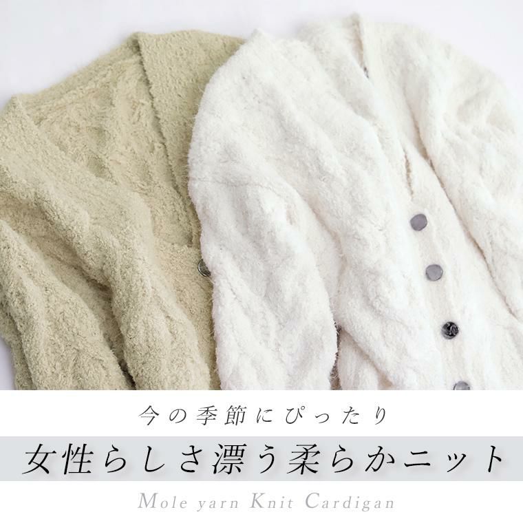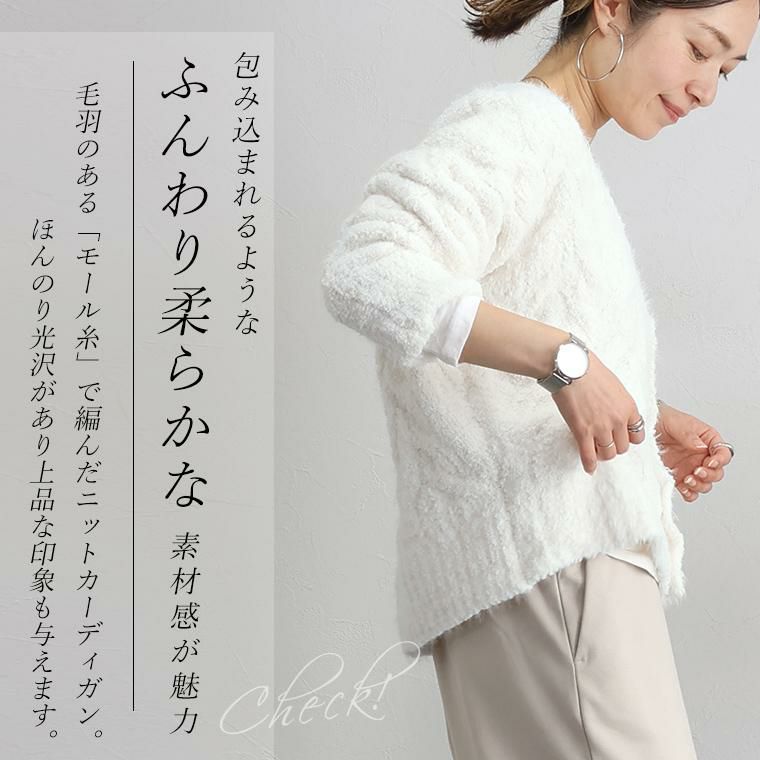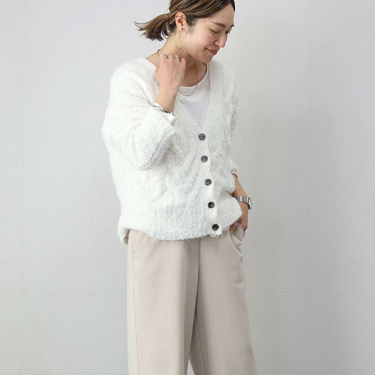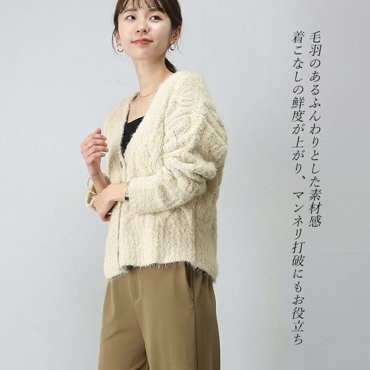 モールヤーンケーブル編みVネックカーディガン ふんわり柔らかで軽い着心地が魅力のモールヤーンカーディガン。 モール糸と呼ばれる毛羽のある糸で編まれ、ほんのりと光沢のある 滑らかな素材感が特徴。さっと羽織るだけで女性らしい雰囲気に 包まれます。全体にあしらわれた立体感のあるケーブル編みが アクセントとなり、単色ながらもきちんと着映え。シンプルな シルエットなので、パンツにもスカートにも合わせやすく、 これからの季節のワードローブに活躍する旬ニットです。
