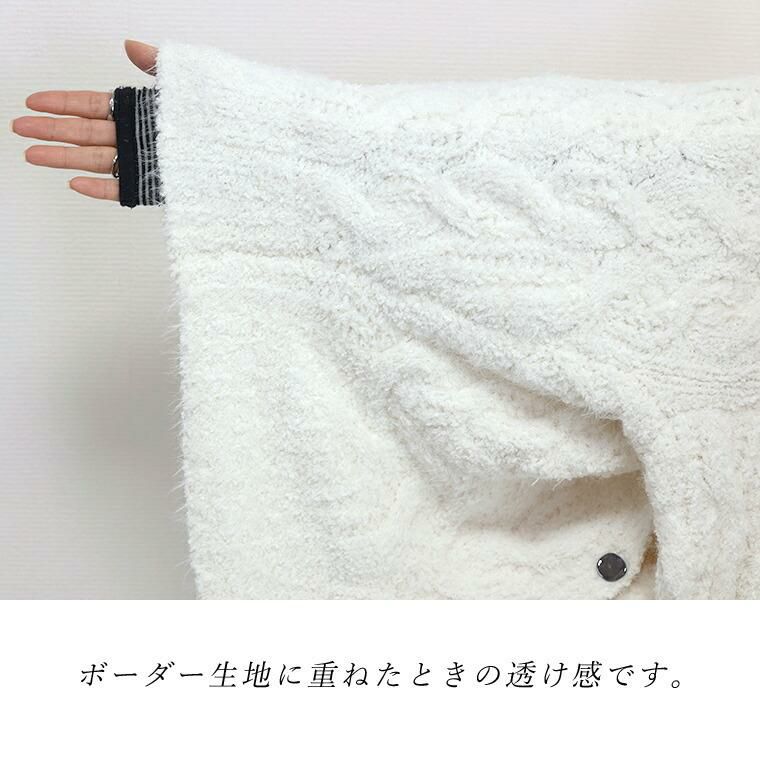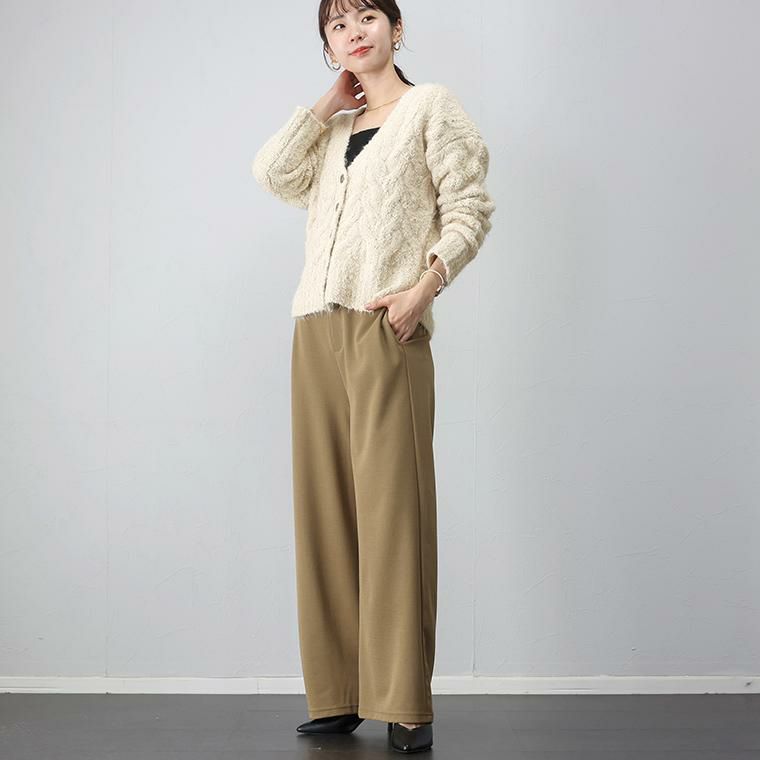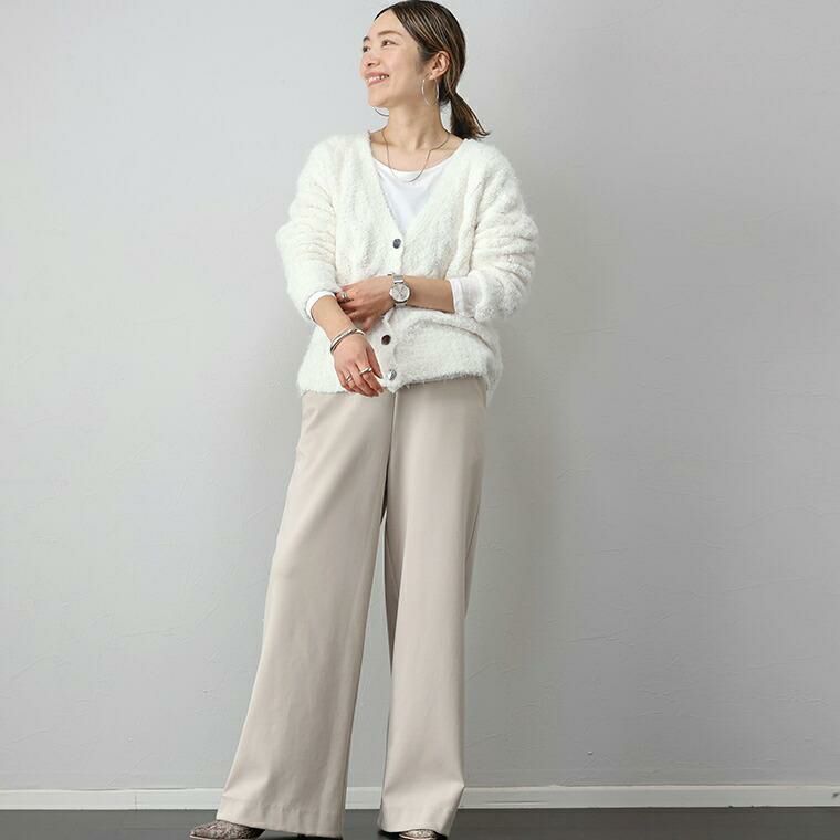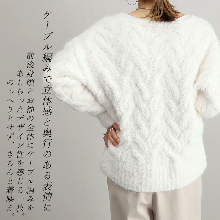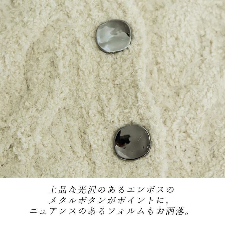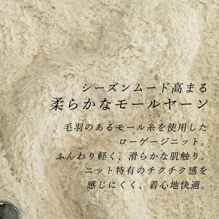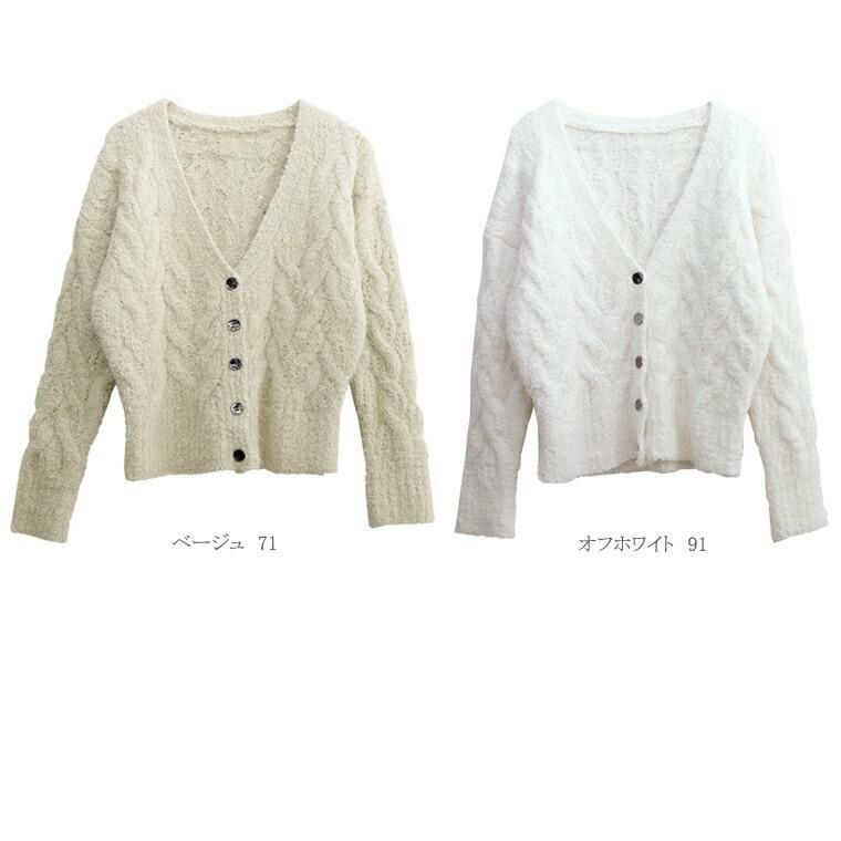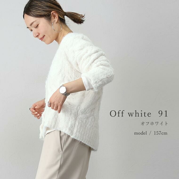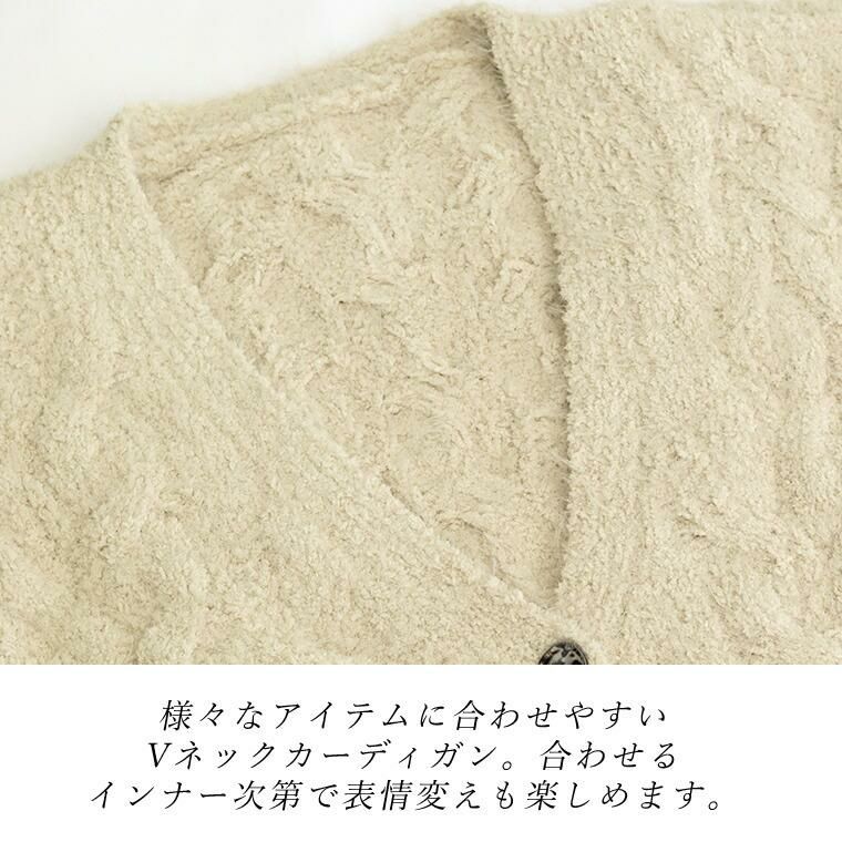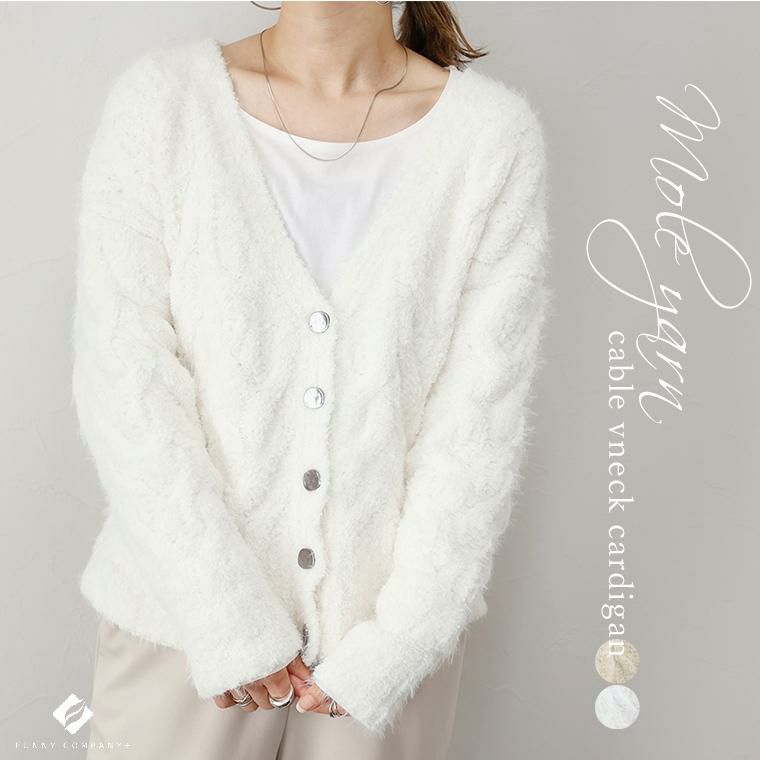 モールヤーンケーブル編みVネックカーディガン ふんわり柔らかで軽い着心地が魅力のモールヤーンカーディガン。 モール糸と呼ばれる毛羽のある糸で編まれ、ほんのりと光沢のある 滑らかな素材感が特徴。さっと羽織るだけで女性らしい雰囲気に 包まれます。全体にあしらわれた立体感のあるケーブル編みが アクセントとなり、単色ながらもきちんと着映え。シンプルな シルエットなので、パンツにもスカートにも合わせやすく、 これからの季節のワードローブに活躍する旬ニットです。