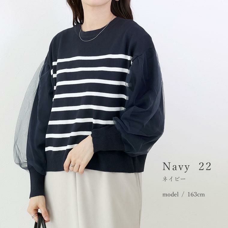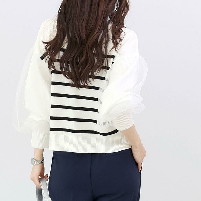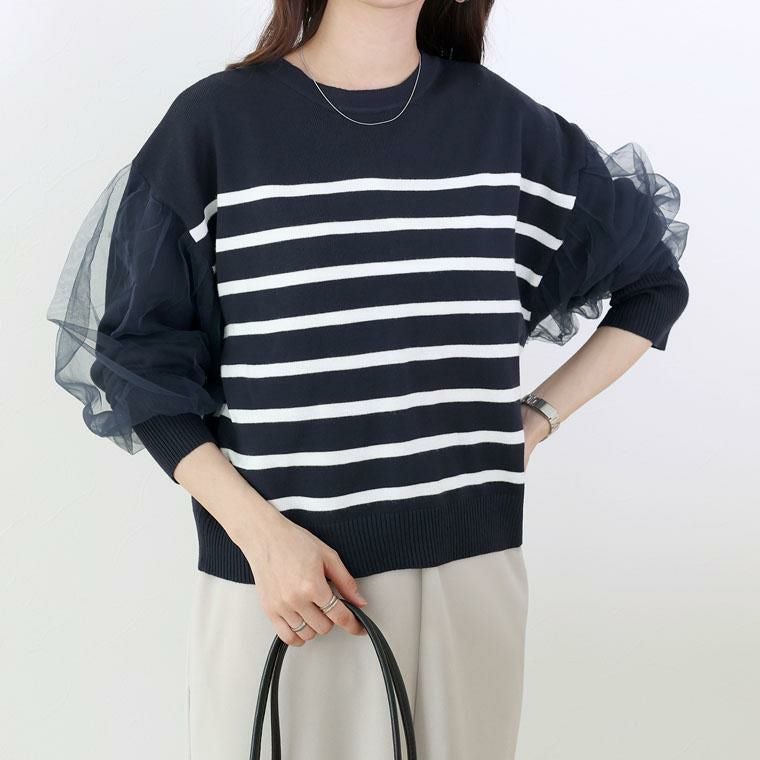 後ろボタンと袖に重ねたチュールが女性らしいディテールの2WAYトップス。12Gのハイゲージニットはきめ細やかな編地で、上品な質感と洗練された印象に。レーヨン混素材で柔らかくしなやか。肌に心地よくなじみ、女性らしいシルエットを演出します。春に似合うパネルボーダーで大人の抜け感をアピール。カジュアル過ぎず、洗練された雰囲気に仕上がります。大人っぽいピッチのボーダーがバランスの取れたデザインで高見え効果。袖に重なるチュールが華やぎ、動くたびに揺れる上品なディティールです。袖口と裾のリブでメリハリを演出。手首と腰回りを華奢に見せ、全体のシルエットを美しく整えます。前後どちらでも着られ、カーディガンにもなる3WAY仕様です