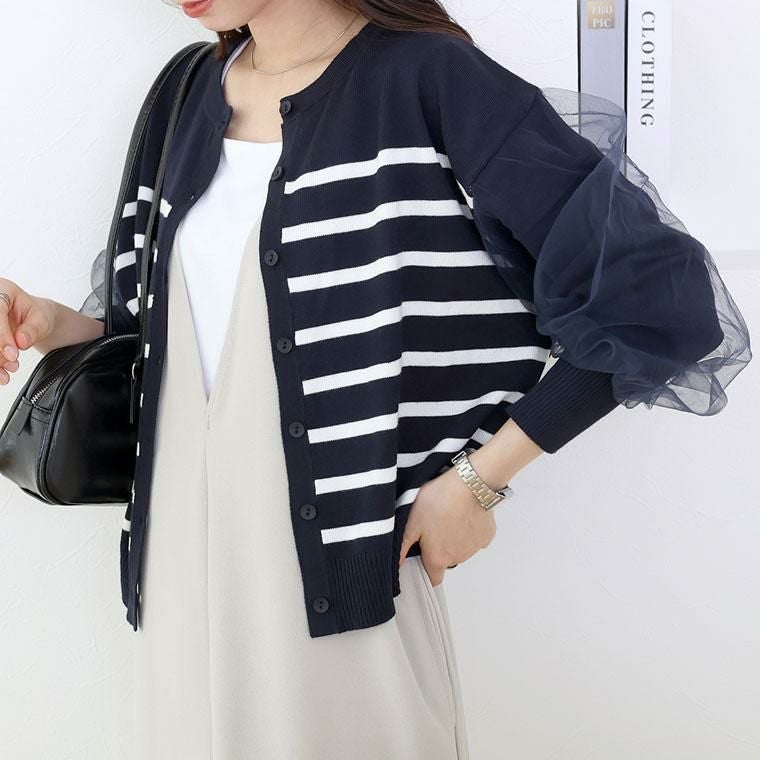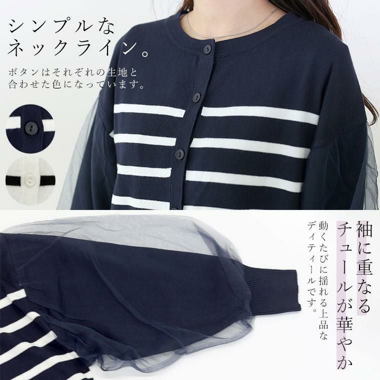 袖チュール重ねボーダー2WAYカーディガン 【メール便不可】