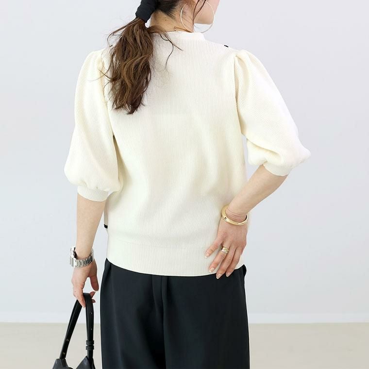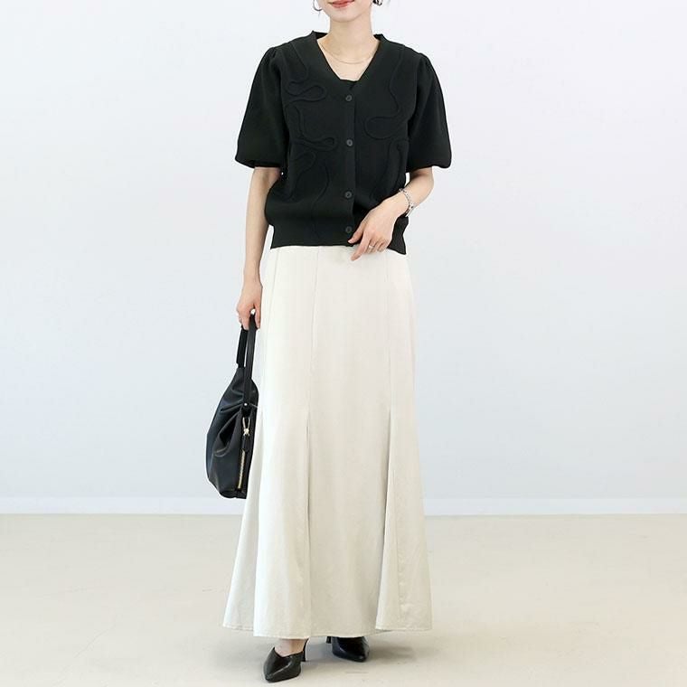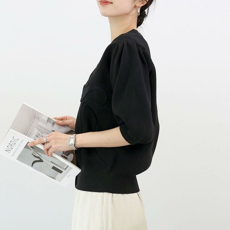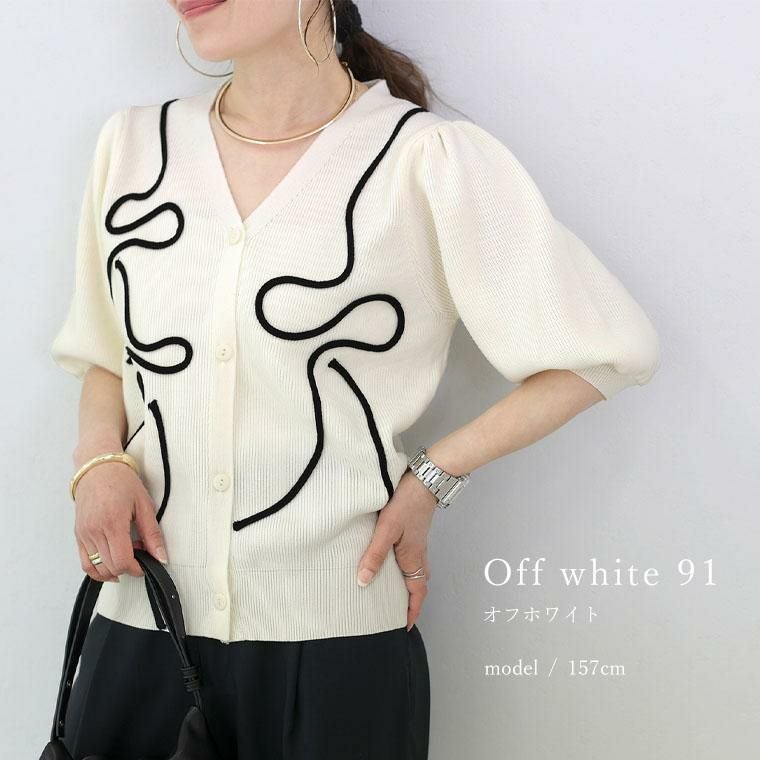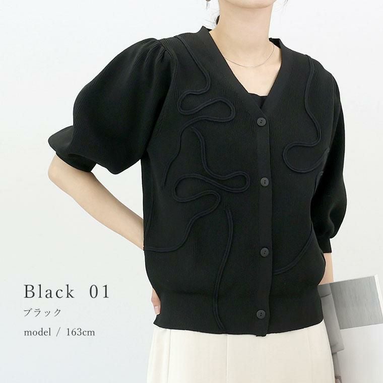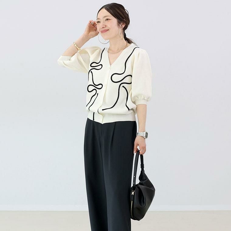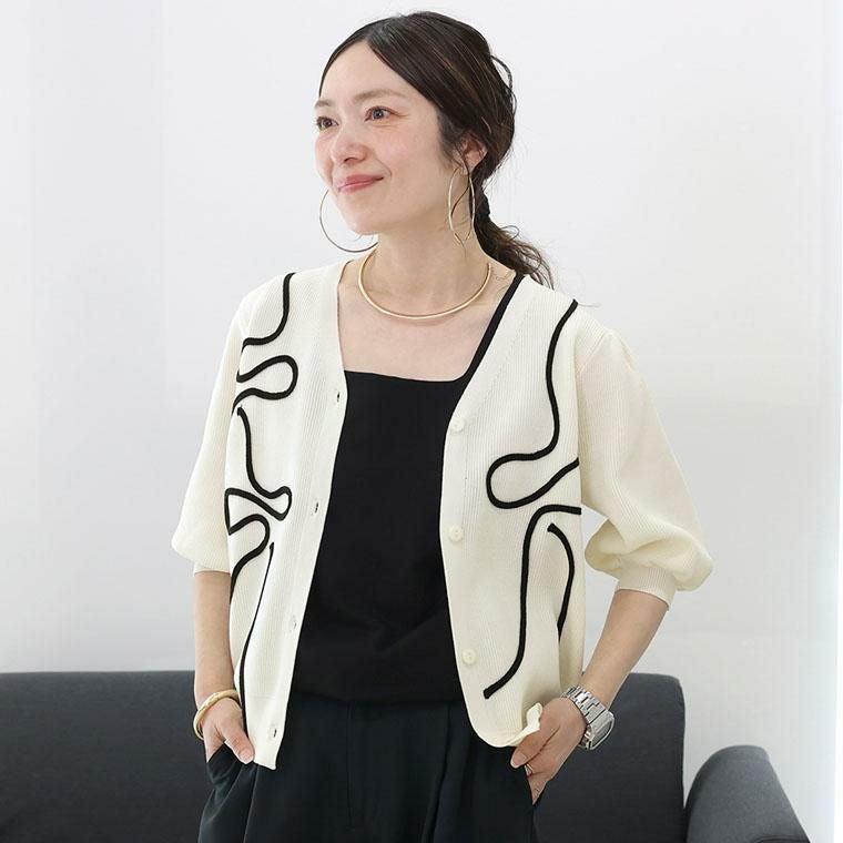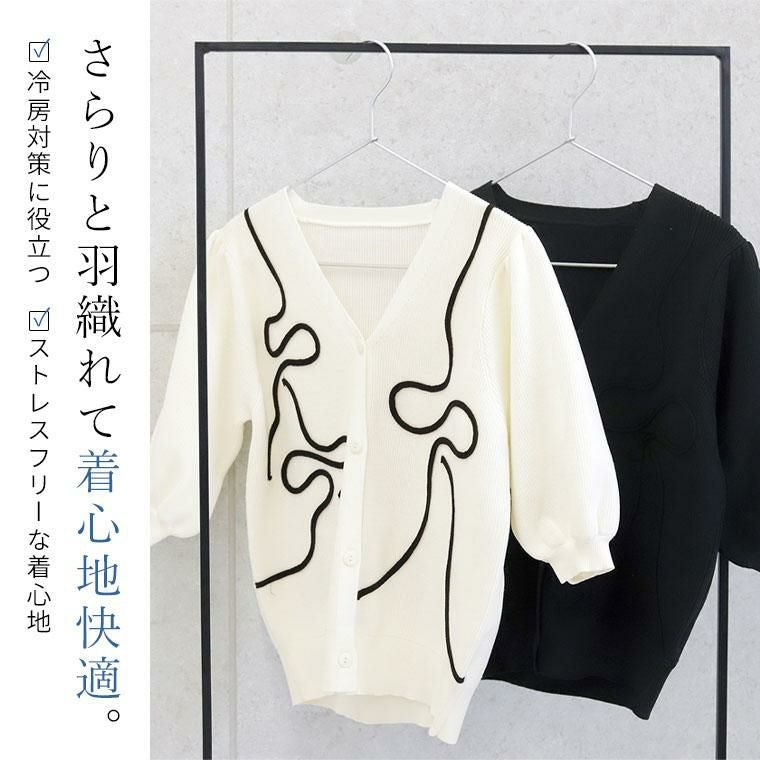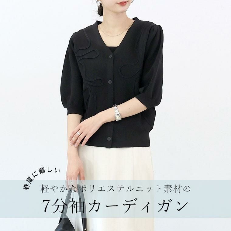 春夏に嬉しい軽やかなポリエステルニット素材の7分袖カーディガン。フロントにあしらわれたコード刺繍が控えめながら華やかさをプラス。畦編みが生む凸凹感で、さり気ない高見えと奥行きを演出。デコルテを美しく見せるVネックで顔周りすっきり。ふっくらしたボリューム袖で二の腕周りをさり気なくカバーします。袖口&裾はリブ仕様で、シルエットが引き締まります。腰にかかる着丈でどんなボトムとも好相性です。伸縮性があり、動きやすくストレスフリーな着心地。さらりと羽織れて着心地快適、冷房対策にも役立ちます。着るだけで女性らしいニュアンスが出せる洗練された万能カーディガンです。