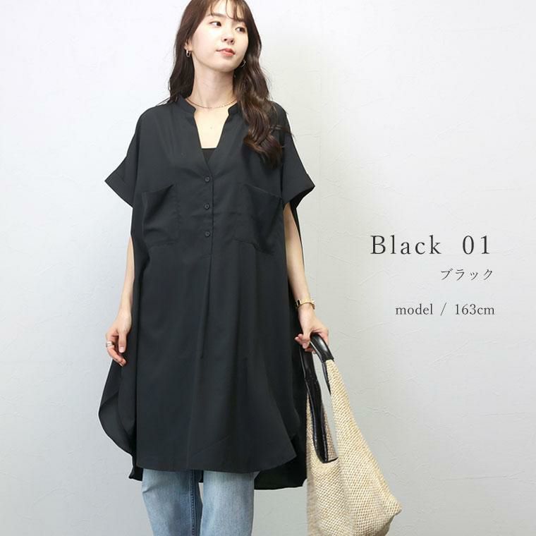 着丈は膝の下から3cm下。袖丈は肘から8cm上。するするっとした肌あたりですごく軽いです。襟のVは深めで、身頃もかなりありますが、着るとそんなに広がらず、思ったよりスッキリ見えます。