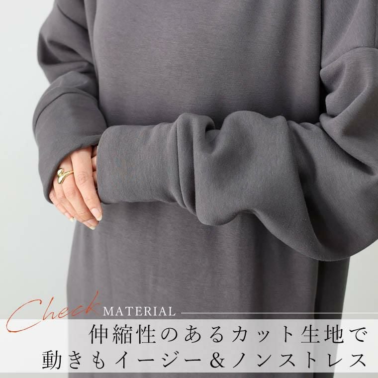 着丈はくるぶしの上くらい。袖丈は手首から21cm下。裏起毛でとても暖かいです。楽な着心地ですが若干重みを感じました。襟ぐりが広めなのでインナー見えに注意です。