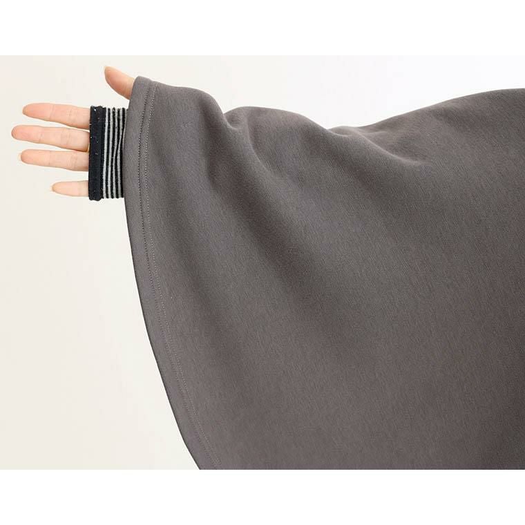 着丈はかかとから2cm下。袖丈は手首から26cm下。裾が床にズってしまうのでヒールは必須です。裏起毛になっていますが袖や身幅にゆとりがあるので窮屈感はありません。襟元が広いので顔まわりがスッキリ見えて◎。