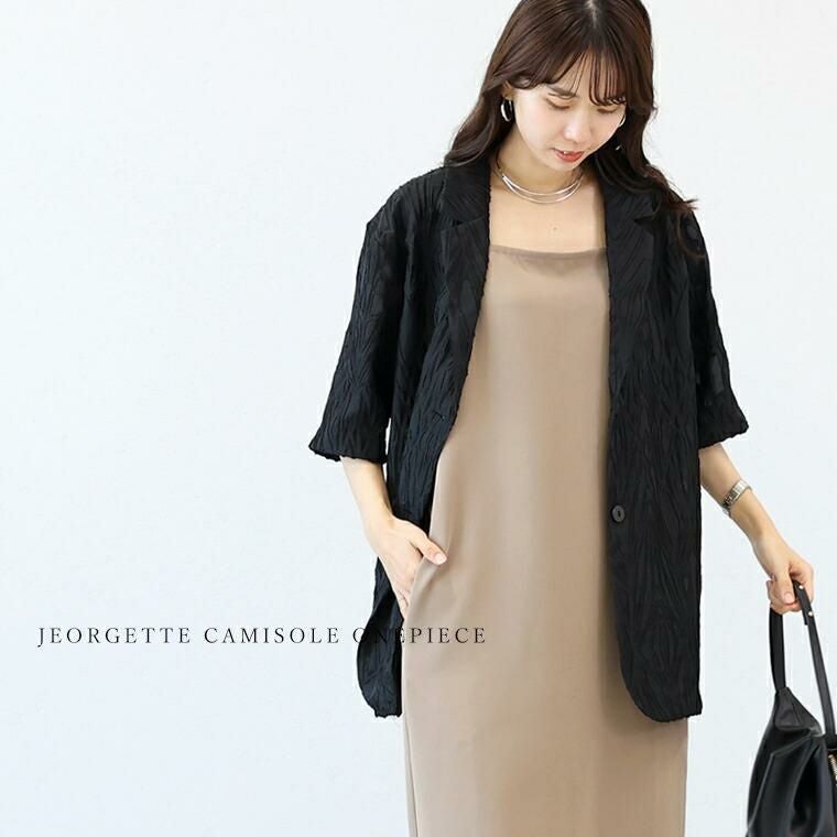角度によって生まれる艶がきちんとした印象にみせるジョーゼット生地で仕立てたキャミワンピース。しっかりとした生地で透け感を気にせず着られ、伸縮素材を織り込むことでしわになりづらくお手入れもスムーズに。合わせるアイテムを変えてロングシーズン着まわせます。縦ラインを強調するロング丈はスタイルアップ効果も。すとんとしたストレートながらもほどよいゆとりを作り、ボディーラインを拾い過ぎないよう絶妙なラインに計算されています。さらに肩のストラップは着丈の調節が可能、身長に合わせて着丈を変えられるのも嬉しい。華奢なストラップとストレートの胸元ラインが上品、大人に似合うディテールがこだわりです。小物や重ねるアイテムでカジュアルにもきれいめにも着られる一着です。