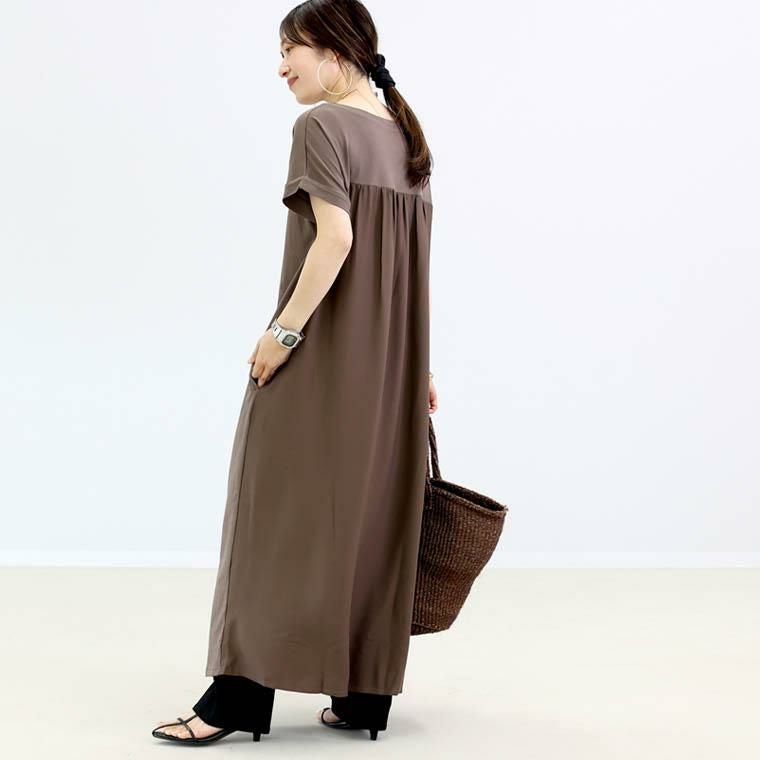 良い素材とこだわりのシルエット。有機栽培で育てたインドの綿だけを使用した、オーガニックコットンのマキシ丈ワンピースです。肌あたり優しく環境にも配慮したワンランク上の素材で、さらりドライな着心地。インド綿ならではの通気性と速乾性で、暑い夏にもおすすめの一着です。後ろヨークからジョーゼット布帛の異素材で切替え、軽さと遊び心をプラス。切替部分にあしらったギャザーもポイント。視線を上げ、バックスタイルをすらり見せしてくれます。一着でコーデが完成する頼りになり時短アイテムです。