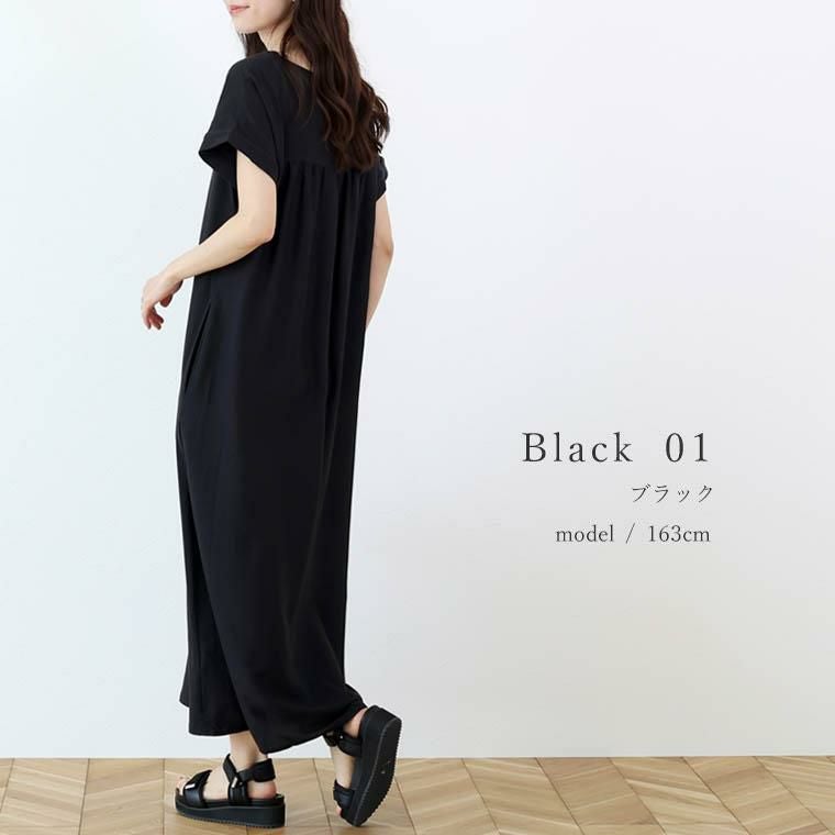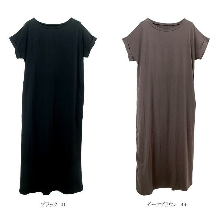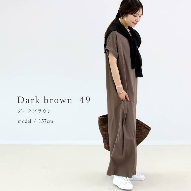 着丈はくるぶしから4cm上。袖丈は肩から17cm下。首まわりは横に広めでインナーが見えやすいです。丈は丁度良いです。細身ですが体のラインを拾わず脚長に見える気がします。サイドにポケットがあり便利でいいですね。