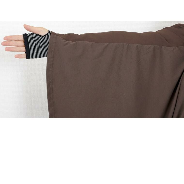 着丈はくるぶしくらい。袖丈は肩から15cm下。身幅は程よくゆとりがあり体のラインを拾わずストンと着れます。後ろの生地は伸縮性がありませんが、肩を動かしても張りません。丈も丁度良いです。