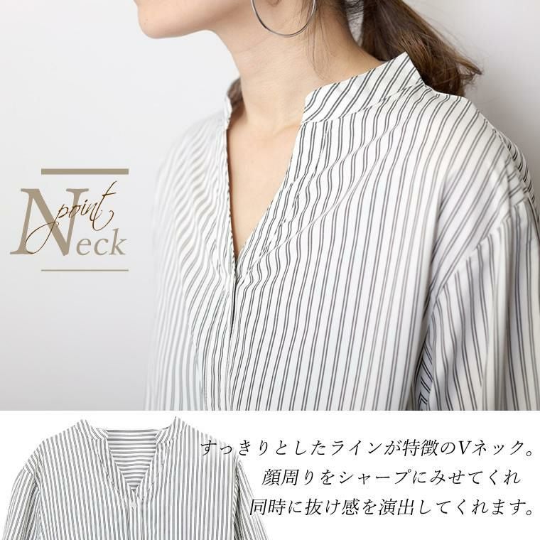 着回しやすさも抜群です。襟元はシャープなVネック。顔周りをすっきりと見せ、