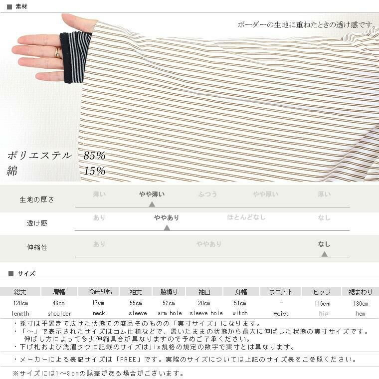 | 着丈は足首から15cm上。袖丈は手首から7cm下。ボタンを閉めても窮屈感はなく体にもフィットしません。透け感が少しあるのでインナー注意です。軽くて楽な着心地です。 |