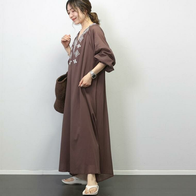 独特の風合いをもつインド綿に、エスニック刺繍をあしらった一枚でサマになるワンピース。襟回りの刺繍が顔まわりを華やかに明るい印象にみせます。単色のビスコース糸を使用することでナチュラルになり大人っぽく着られるのもこだわりです。襟元は女性らしく抜け感のあるキーネック。襟に沿うようにあしらったVモチーフの刺繍がシャープなアクセントになっています。切替や締め付けのないエフォートレスなシルエットでストレスのない着心地。通気性、吸湿性に優れた極薄の綿ボイル生地で仕立て、汗ばむ季節も快適に。着映え感抜群、一枚でお洒落が完成するロングワンピースです。