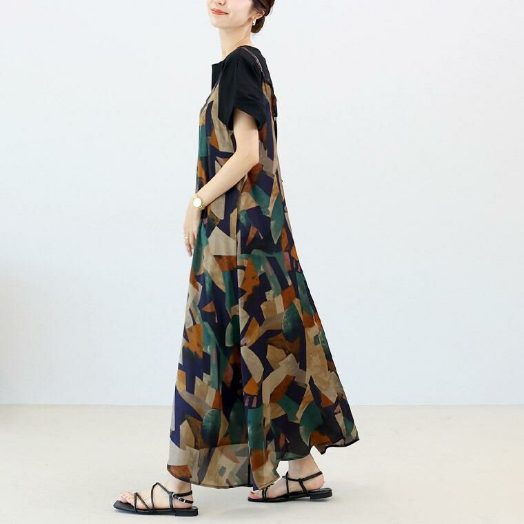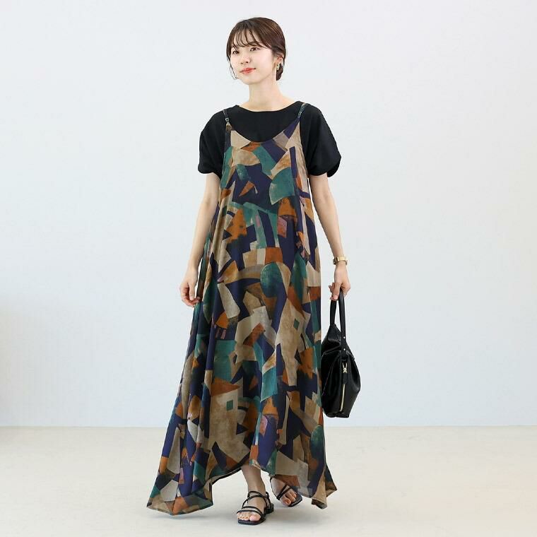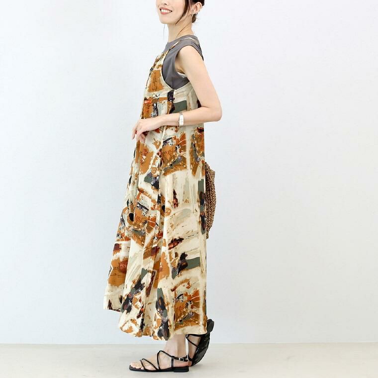裏地がない軽い仕様で、シンプルなワンツーコーデに重ねて着用するレイヤードアイテムです。大胆な色柄使いで存在感抜群の装いに仕上がります。甘さのないモチーフで大人の女性の装いも合わせやすい。滑りの良い繊細な極薄生地で仕立てられており、重ね着しても重たさを感じづらいです。華奢なストラップが女性らしい印象。ストラップにはアジャスターがついていてサイズの調節が可能です。裾に向かってたっぷりと広がるシルエット。動きに合わせて優雅に揺れるラインが綺麗。Vネック側のストラップ付け根には共布紐があしらわれており、後ろにしたときには結んで、前にしたときには垂らしてアクセントに。脱マンネリが即叶うアイテムです。お好みでUネックとVネックで着用できる前後2WAY。