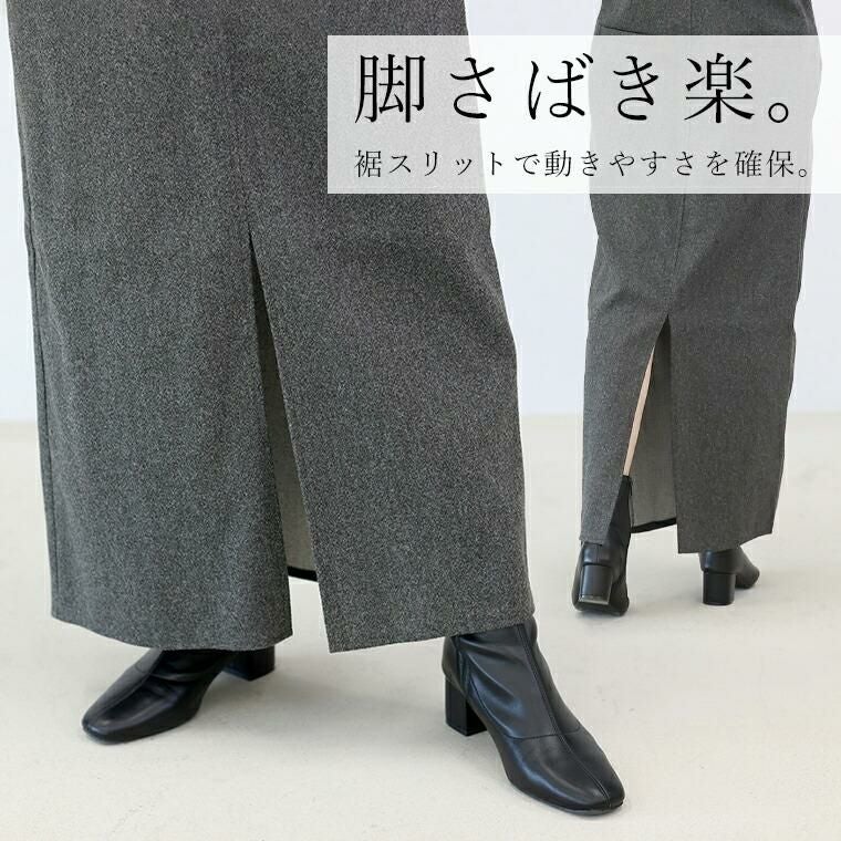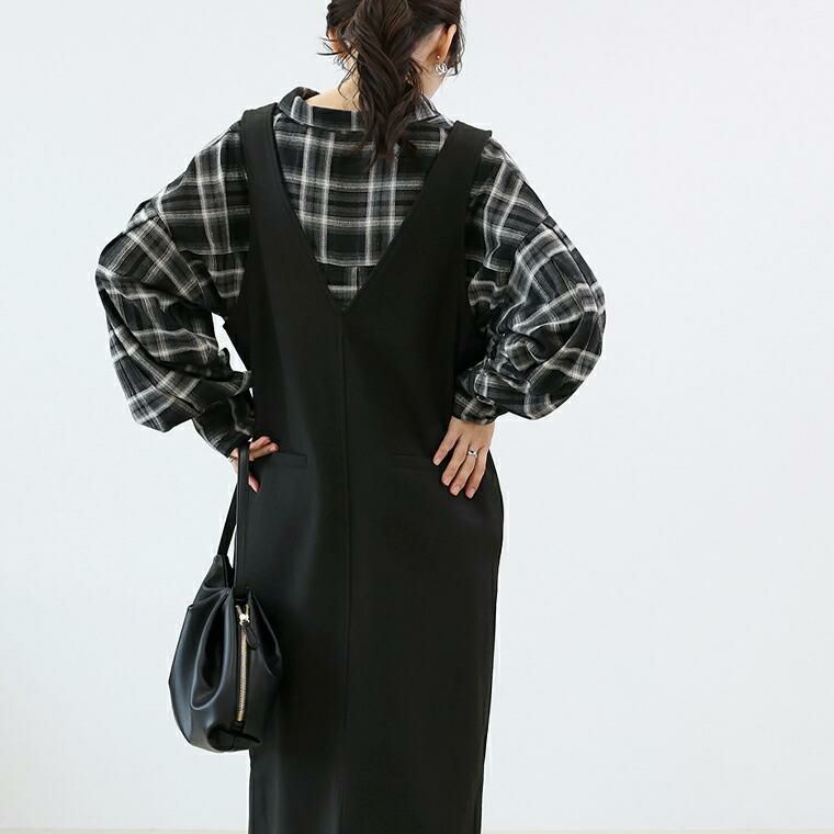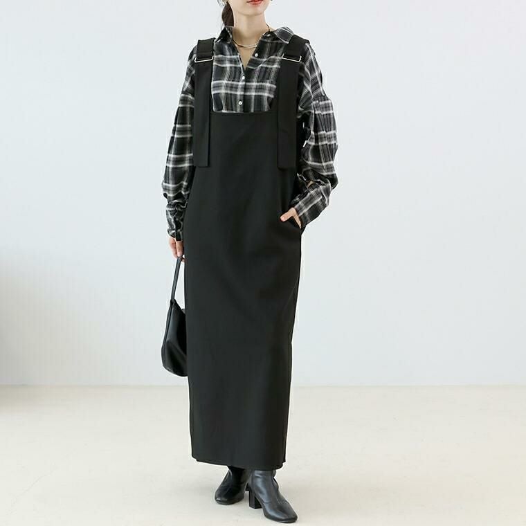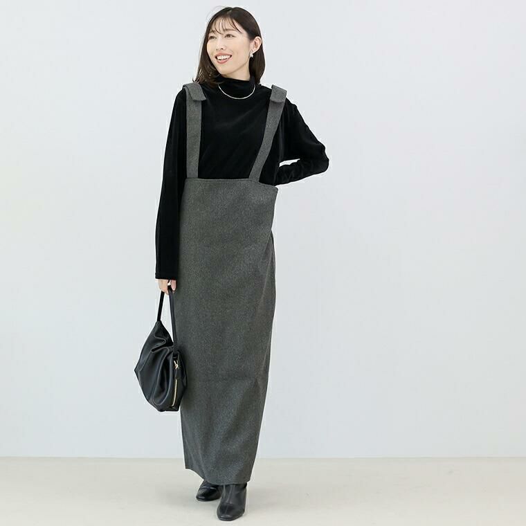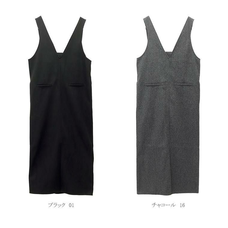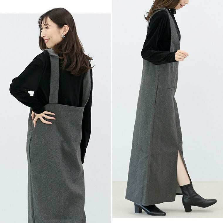 フェイクウールで温かみと上品さを演出するサロペットワンピース。しっかりした生地で体のラインを拾わず、安心の着心地。ストレートシルエットで縦ライン強調、スタイルアップ効果。前後2WAY仕様で、Vネックとストレート胸元の両方が楽しめる。Vネックは顔まわりすっきり、女性らしい印象に。ストレートの胸元はシンプルでクリーンな印象、幅広いコーデにマッチします。フェイクポケットがアクセント。太い肩ベルトがアクセントになり、上半身を華奢に見せます。肩ベルトは長さ調節可能で、身長や着丈バランスに対応。裾スリットで脚さばきラク、動きやすさも確保。インナーを変えて様々な着こなしを楽しめます。着こなし自在で美しい、大人のための頼れるサロペットです。