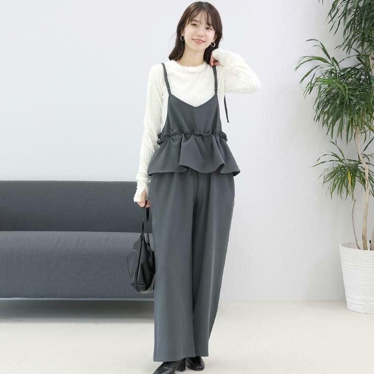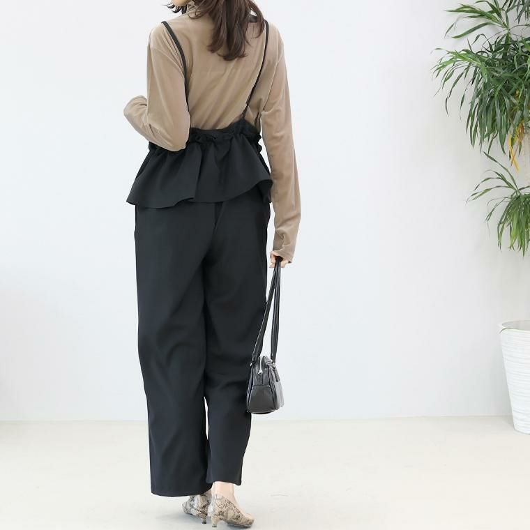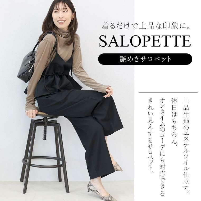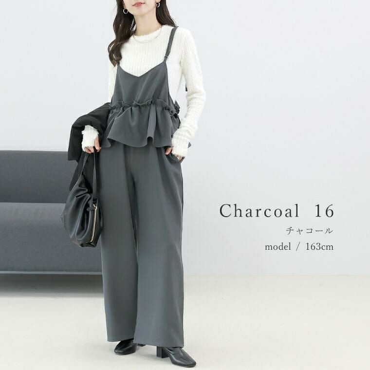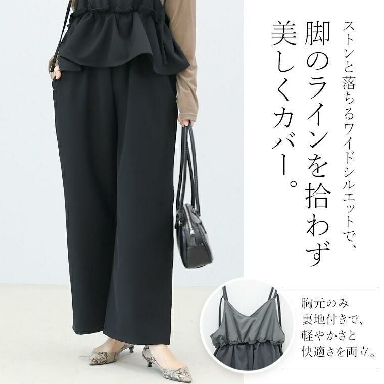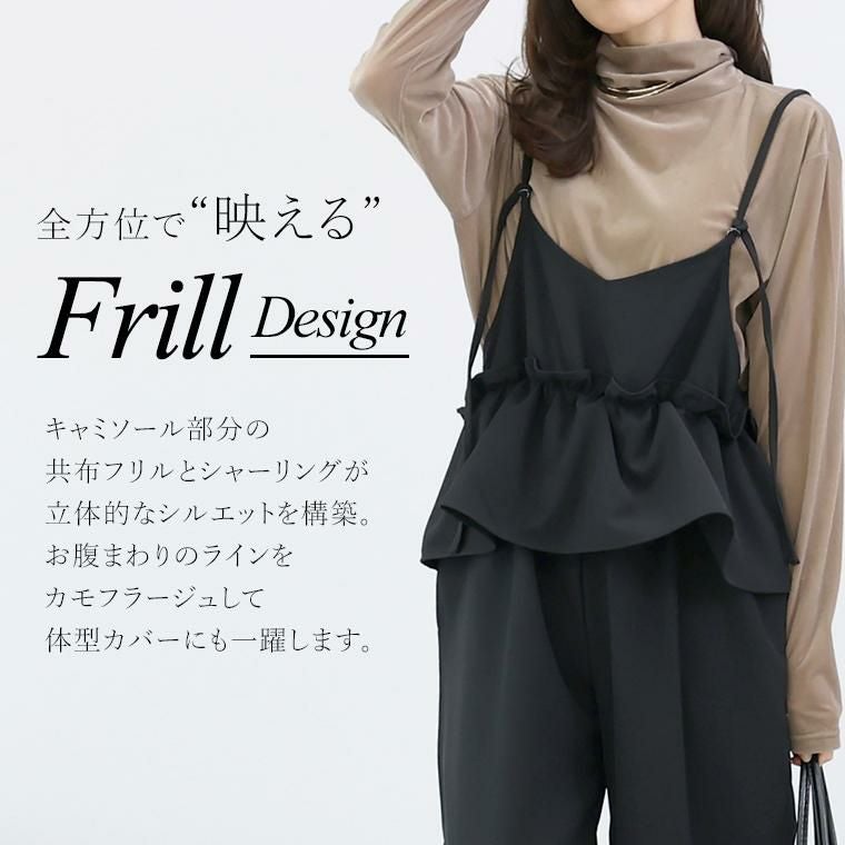 共布フリル&シャーリングで立体感を演出、華やかな印象のサロペット。フリル付け根はゴム仕様で程よくフィットして、動いてもズレにくく快適な着心地です。アジャスター付きストラップは、お好みの位置、バランスで調整可能。ハイウエストのフリル切替で脚長シルエットに期待できます。パンツ筒は脚のラインを拾わず美しくカバーするワイドシルエット。キレイ見えするエステルツイル素材仕立てだから、カジュアルすぎません。上品に着こなせる絶妙なデザインバランスで、オフィスにもお出かけにも対応します。