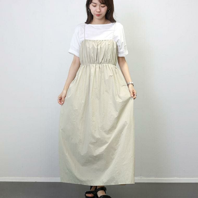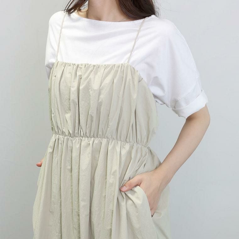 シャカシャカしたドライタッチ素材が今年らしいキャミワンピ。ややハリとシボ感がある柔かな素材なので肌あたりが気持ちいいです。フロントは、たっぷりギャザーを寄せて立体的に。ふっくらしたシルエットが女性らしいラインをつくります。華奢なストラップは背中で結ぶ仕様となっていて、無段階でサイズ調整が可能です。スカート部分には裏地付きで透け感を軽減。インや羽織りアイテム次第に色んなコーデが楽しめるワンピースです。