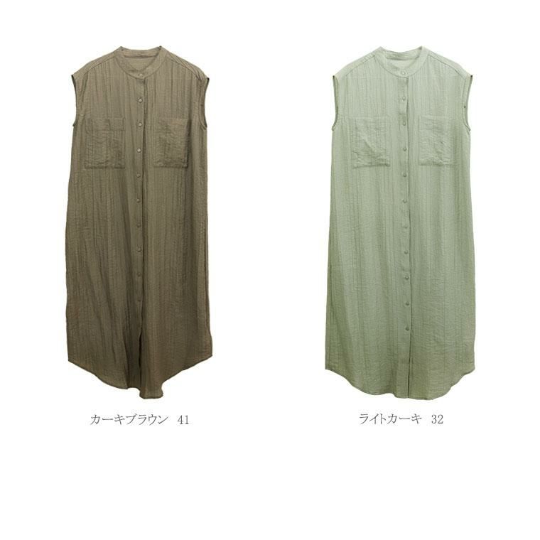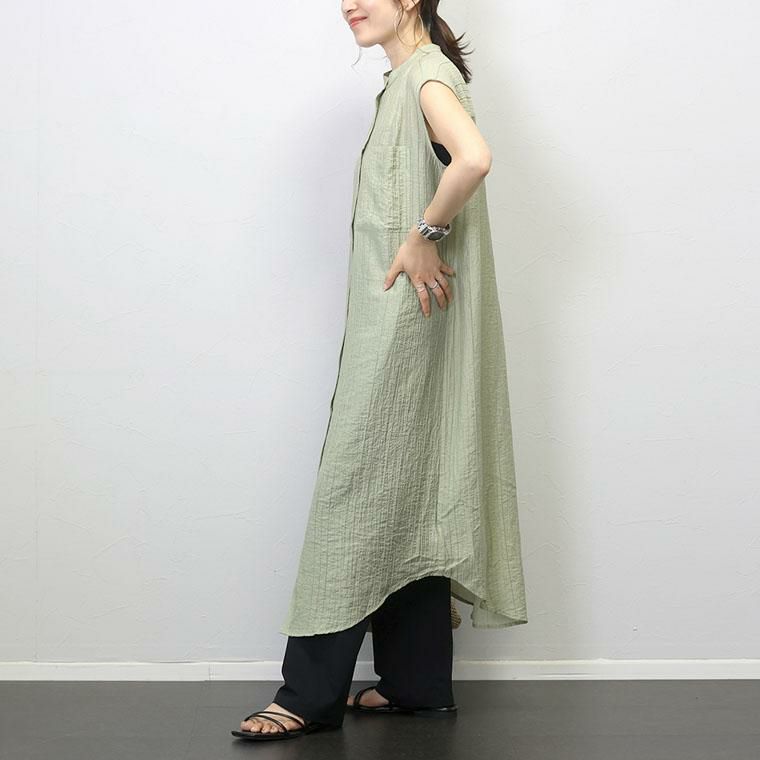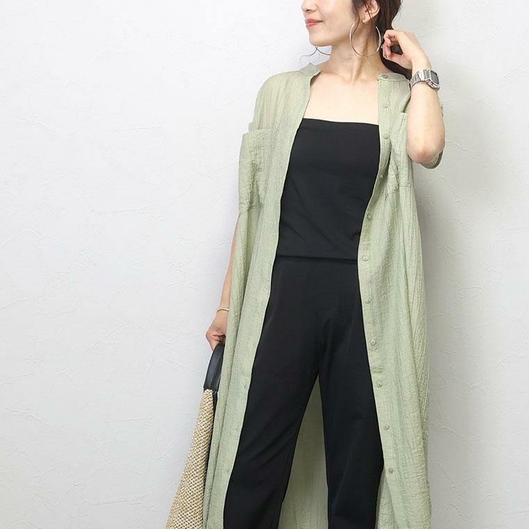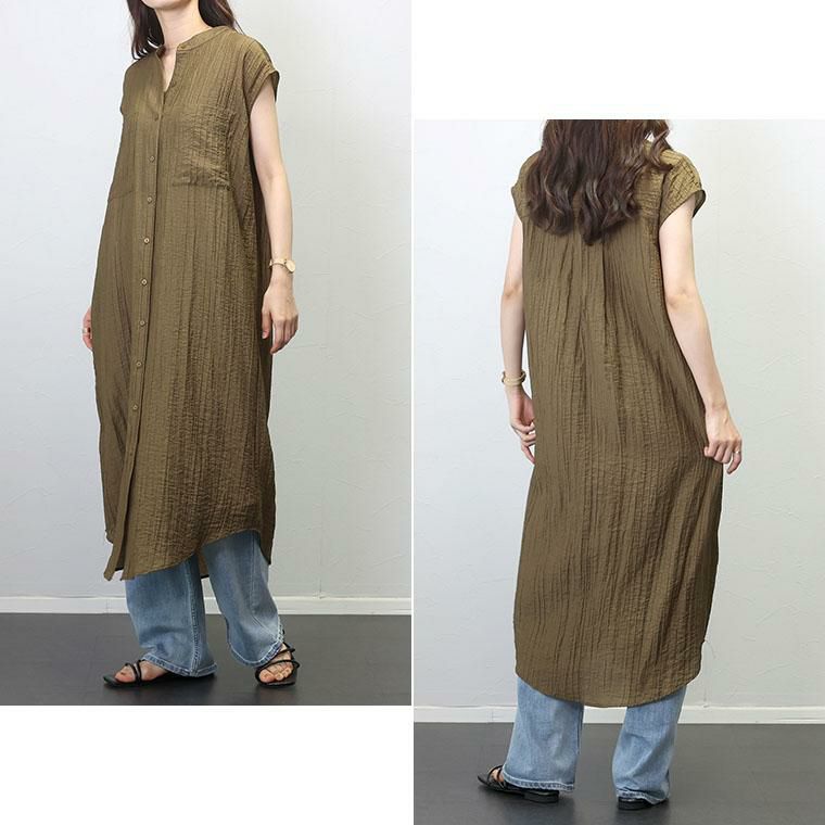 凸凹感のあるシアー素材にストライプ見えする織り模様をあしらったさらりとした生地。単色ながら奥行きのある雰囲気です。透け感が涼し気な印象。ボタンの開け方で雰囲気が変わるバンドカラーの襟元。両ポケデザインがポイントで、視線を上にあげてくれるのでスタイルアップ効果があります。後ろヨークのタックが背中に立体感を生み、体のラインを拾いづらくし、長い着丈もすっきり見せます。ボタンを全部開けて羽織としても使えます。Iラインシルエットが縦のラインを強調し、着痩せ効果を誘います。