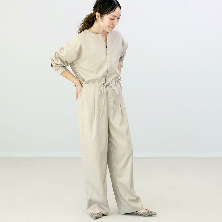 シャツのセットアップのようなデザインのオールインワン。コーディネートを考えなくてもこれ1着でお洒落な着こなしが即完成します。杢調のツイル生地で上品見えする素材です。薄手で裏地が無いのでインナーを変えて通年着まわせます。胸元の肌見せが女性らしさを高めるキーネック。ステッチの出ない身返しデザインで洗練された雰囲気に。重なる襟元が縦のラインを強調して上半身をシャープに見せます。シャツ仕様のカフスデザインできちんと感のあるデザイン。ウエストのドロストでシルエットの調節が自在。Xラインを作ることでウエスト周りのラインをカバーし、フェミニンなスタイルに。左右に便利なポケット付き。フェイクのバックポケットでヒップアップ効果。切替のタックが腰回りにゆとりを生みます。後ろヨークの切替が視線を上にあげ、スタイルを良く見せます。