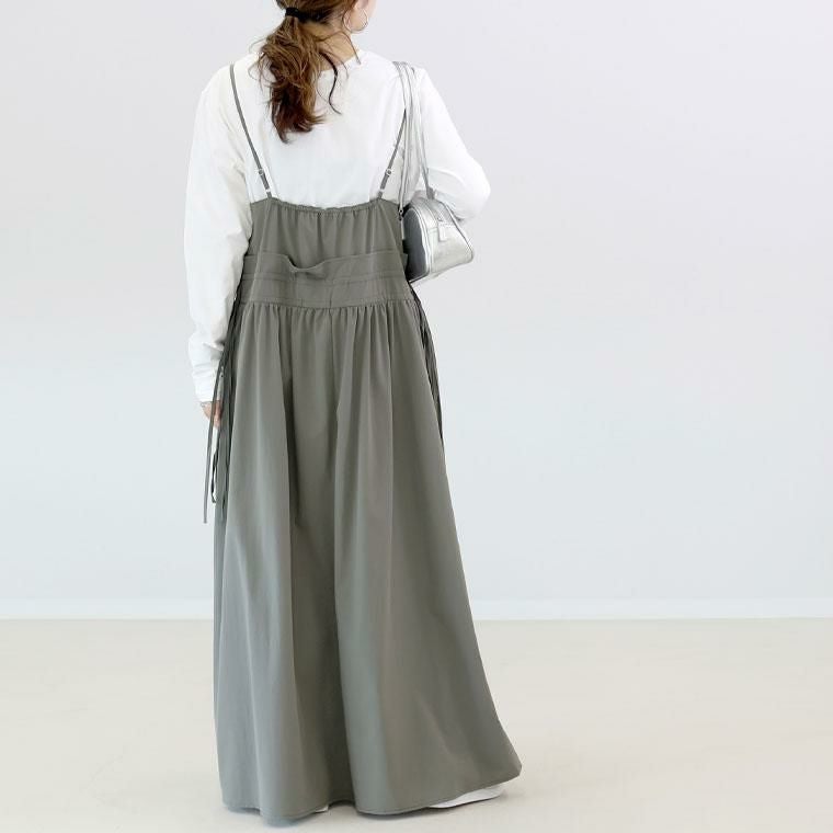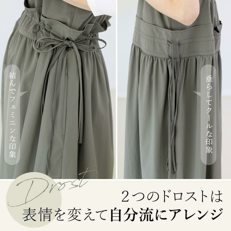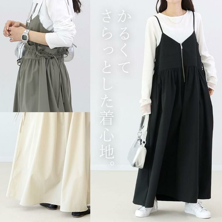 軽くてドライタッチなシャカシャカ生地を採用したロングキャミソールワンピース。裏地がなくても透け感はほとんどなし、ほどよくハリがありシワになりにくいから、デイリーコーデに加えやすいです。フロントジップと前横にあしらったドロストがお洒落な雰囲気。ドロストを絞ってハイウストラインをつくることもでき、アレンジ次第で多様な着こなしを楽しめます。ドロストを絞るとウエスト部分にフリルが生まれてフェミニンな印象にチェンジ。シンプルなTシャツやブラウスと合わせたコーデもおすすめ。重ね着するだけで即おでかけコーデが完成する着まわし時短アイテムです。