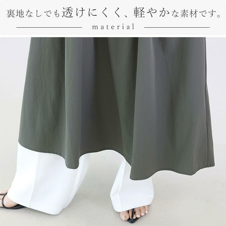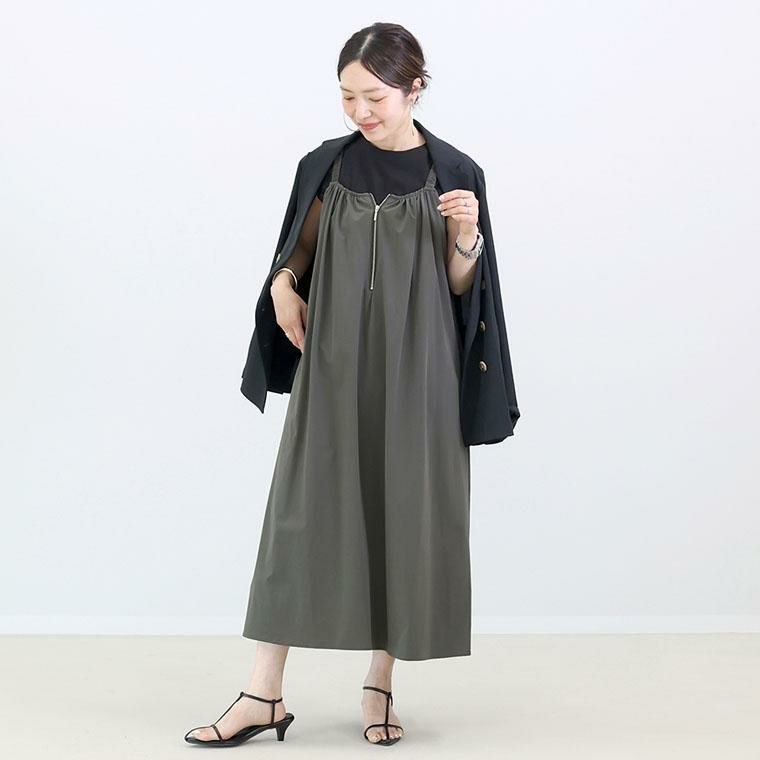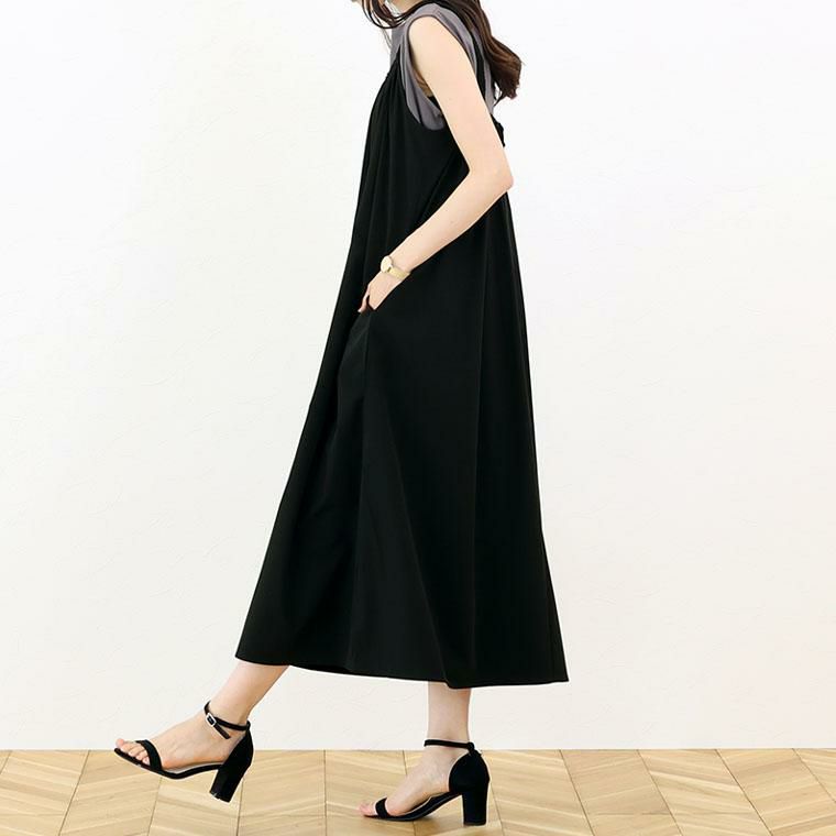 シンプルなトップスに重ねるだけでスタイルが決まる便利なワンピース。ロング丈×Aラインシルエットで、気になる腰まわりや太ももを自然にカバー。シャカシャカとした軽やかで滑りの良いナイロン×ポリウレタン素材で、伸びやか&動きやすい着心地です。シワになりにくいので、移動や旅行にもぴったり。ゴムシャーリングのストラップが快適な着心地を後押しします。フロントのシルバージップが、シンプルな中に程よいアクセント。胸元と背中のギャザーデザインが立体感と華やかさを演出。華奢で可憐な共布リボンが、後ろ姿にさりげない可愛さを添えます。裏地なしでも透けにくく、軽やかな素材感です。さりげなく便利なスリットポケット付きで実用性もあります。日常にもお出かけにも便利なアイテムです。
