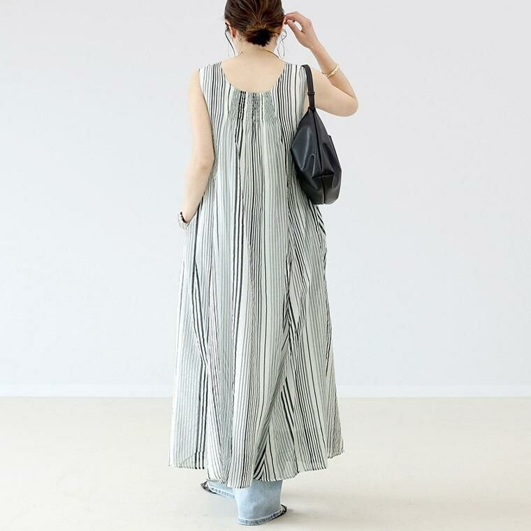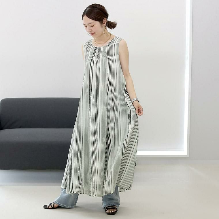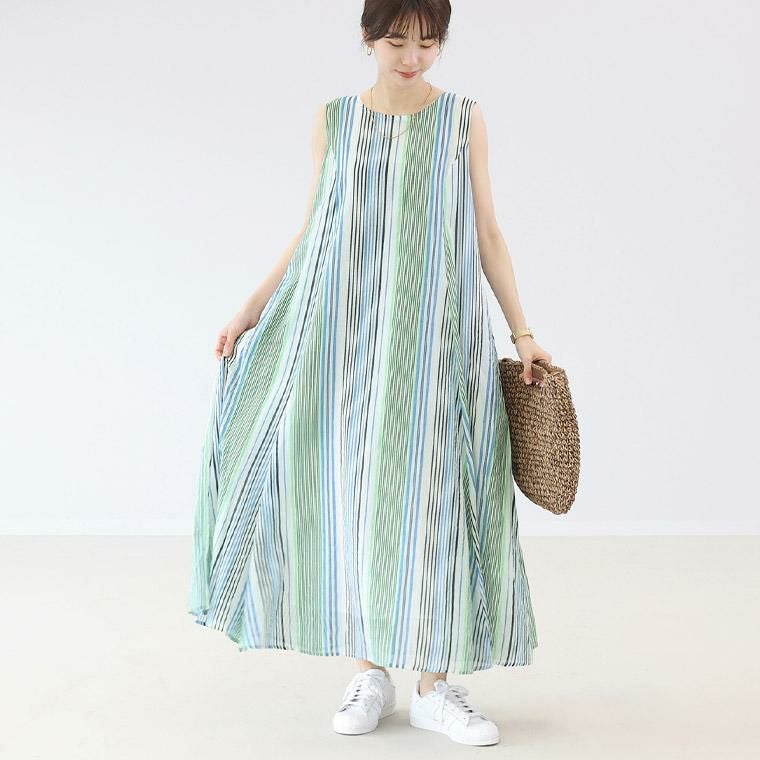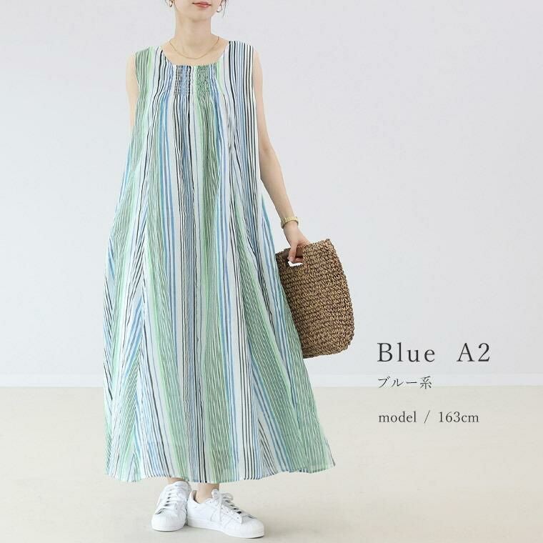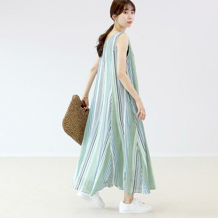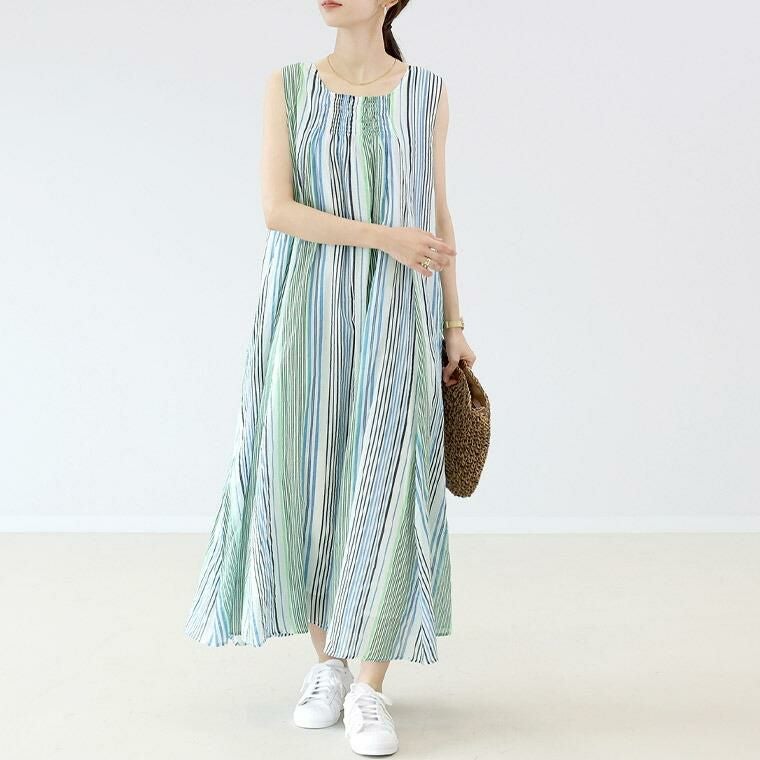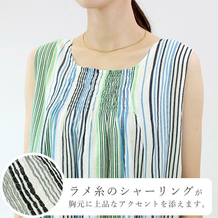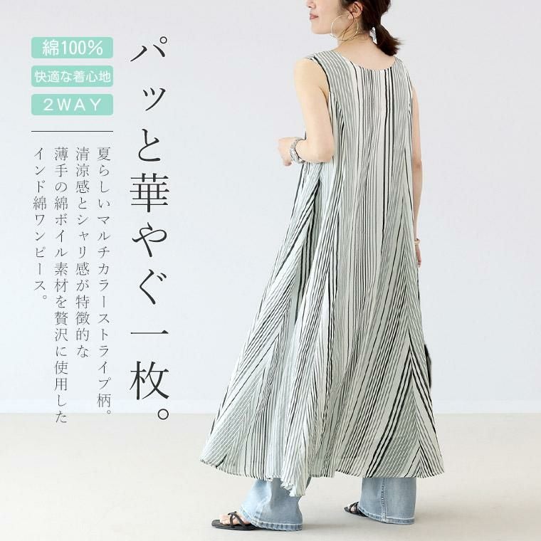 清涼感とシャリ感が特徴的な薄手の綿ボイル素材を贅沢に使用したインド綿ワンピース。肌にやさしいインド綿100%。裏地も綿素材で快適な着心地です。前後2WAYデザインで気分に合わせて襟元の表情を変えられます。夏らしいマルチカラーストライプ柄でパッと華やぐ一枚。ラメ糸のシャーリングが胸元に上品なアクセントを添えます。胸元にダーツ入りの設計で美しい立体感とフィット感を演出。サイドポケット付きなのが便利。軽やかに広がるフレアシルエットが体型カバーと動きやすさを両立します。スリーブレス仕様で涼しく抜け感のある着こなしに。ロング丈で大人らしいバランス。サンダルと合わせるだけで完成度の高いコーデに仕上がります。夏にぴったりな、涼しく軽やかなアイテムです。