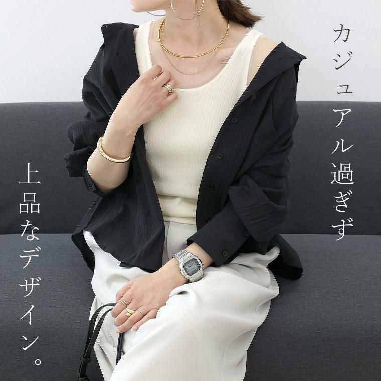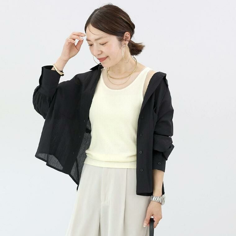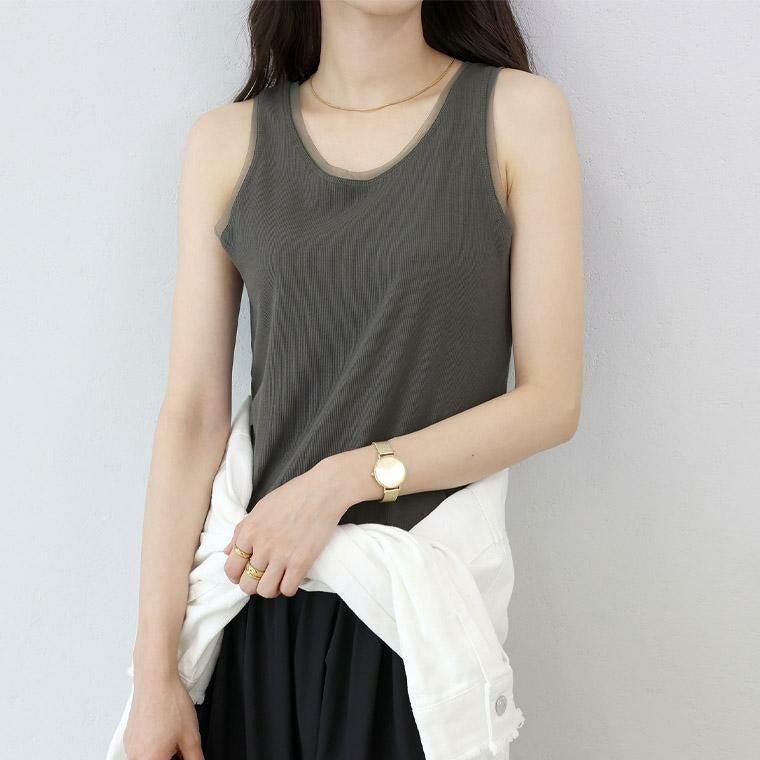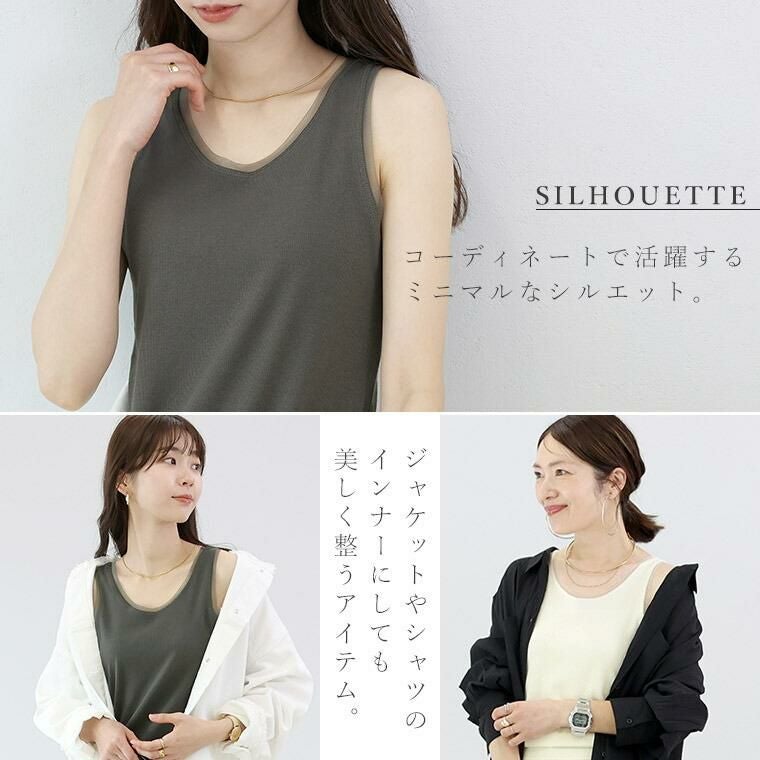 カジュアルすぎず、大人が取り入れやすい上品なデザイン。柔らかく体にフィットする、伸びの良いリブ素材。縦ラインを強調するリブが、すっきりとした印象にみせます。綿にストレッチ糸を織り込んだリブ生地で汗ばむ季節にも快適な着心地です。襟ぐりとアームホールに同色のチュールをあしらい、さりげない華やかさを演出。チュールも伸縮性があり、動きに合わせて優しくフィットします。前後で開きの形が異なる2WAY仕様で、その日の気分や合わせるアイテムに応じて着こなしを変えられます。コーディネートで活躍する、ミニマルなシルエット。ボディラインを拾いすぎず、すっきり見える程よいフィット感。ジャケットやシャツのインナーにしても美しく整うアイテムです。