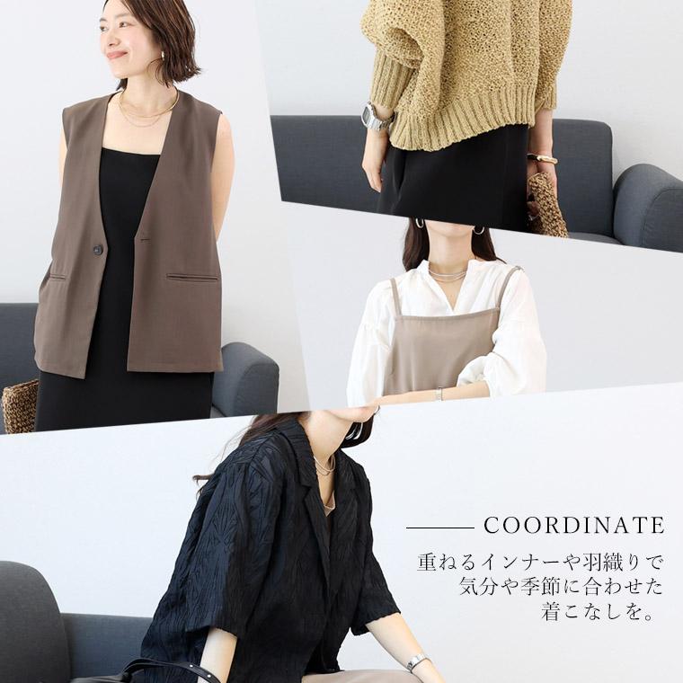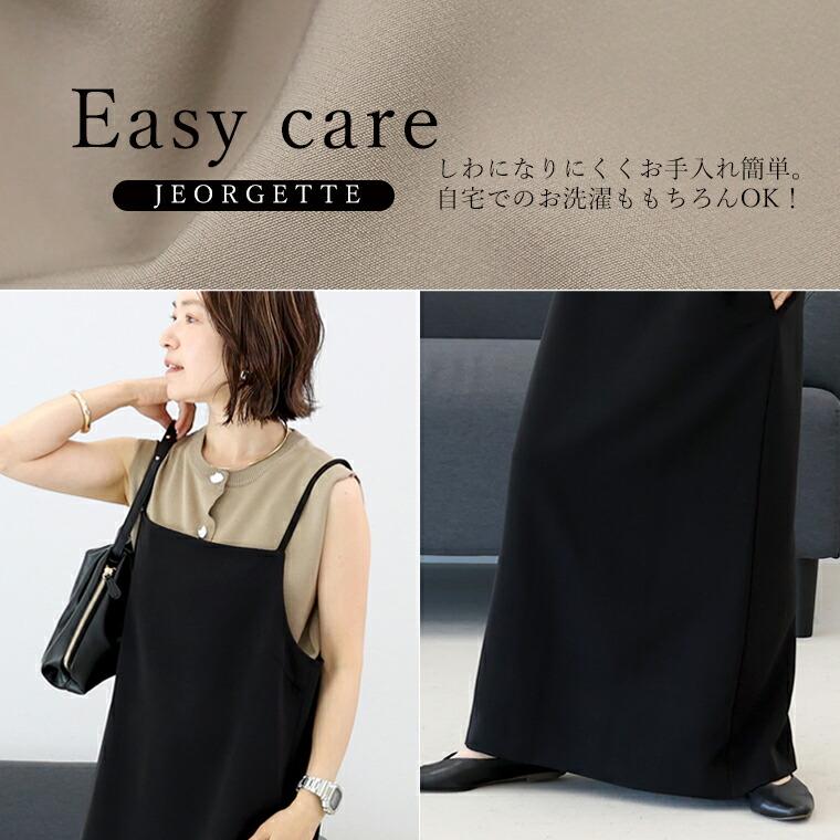 角度によって生まれる艶がきちんとした印象にみせるジョーゼット生地で仕立てたキャミワンピース。しっかりとした生地で透け感を気にせず着られ、伸縮素材を織り込むことでしわになりづらくお手入れもスムーズに。合わせるアイテムを変えてロングシーズン着まわせます。縦ラインを強調するロング丈はスタイルアップ効果も。すとんとしたストレートながらもほどよいゆとりを作り、ボディーラインを拾い過ぎないよう絶妙なラインに計算されています。さらに肩のストラップは着丈の調節が可能、身長に合わせて着丈を変えられるのも嬉しい。華奢なストラップとストレートの胸元ラインが上品、大人に似合うディテールがこだわりです。小物や重ねるアイテムでカジュアルにもきれいめにも着られる一着です。