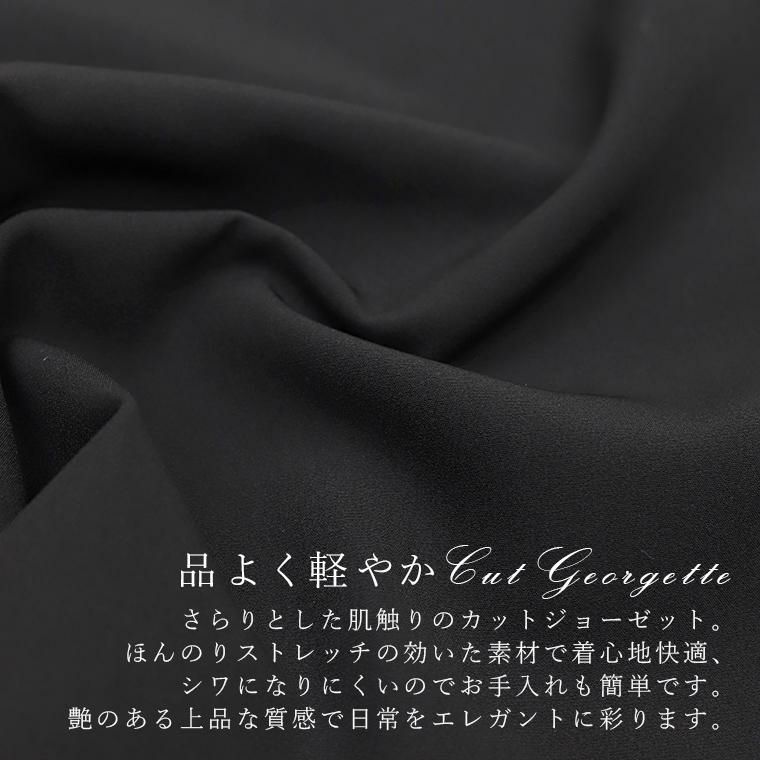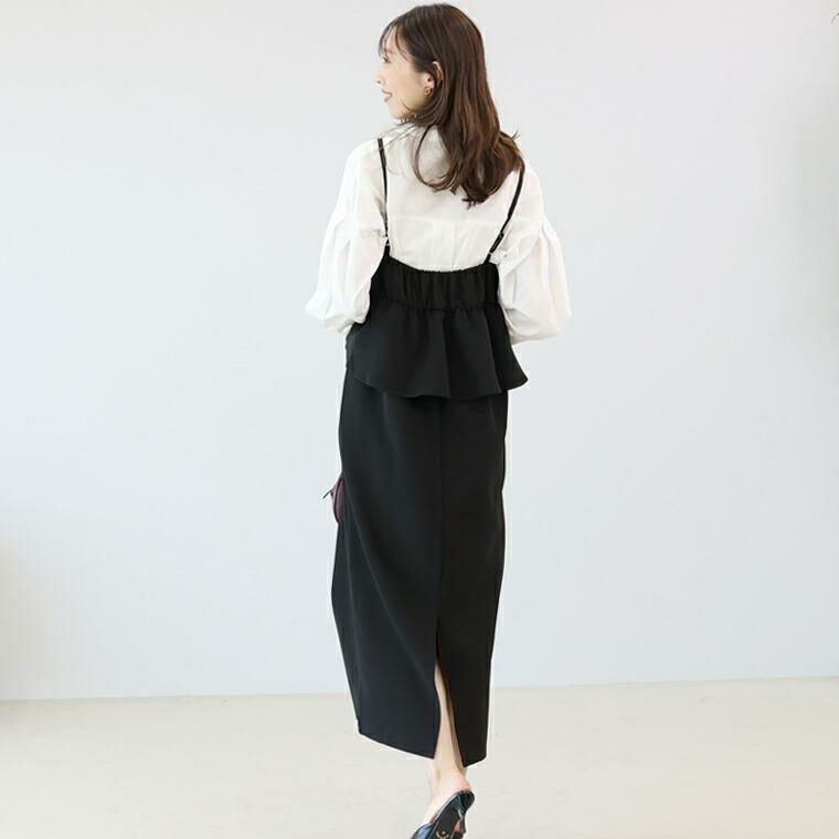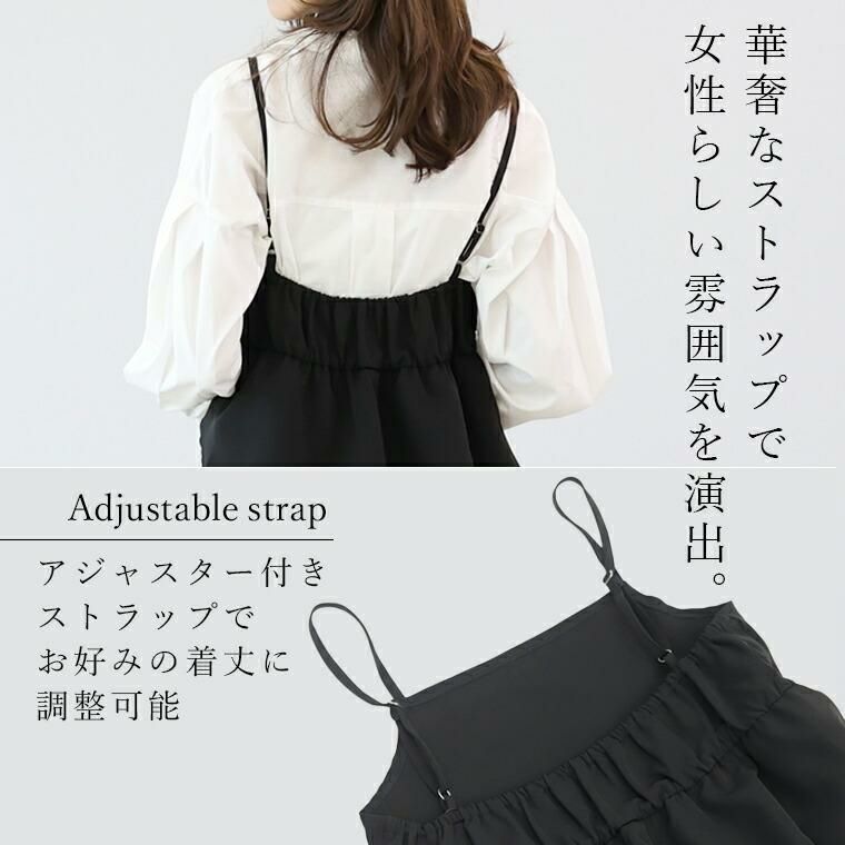 艶やかなジョーゼット素材を使用したペプラムキャミワンピース。Iラインスカートとキャミを重ねたセットアップ風デザインで、トレンド感と体型カバーを両立します。ほんのりストレッチ性があり動きやすく、背中はゴムシャーリング仕様で優しくフィット。華奢ストラップはアジャスター付きで着丈も調節可能。後ろ裾にはスリット入りで足さばきも軽やか。季節を問わず、インナー次第で通年着られる1枚です。