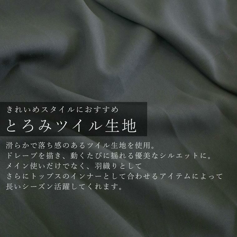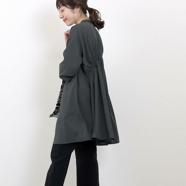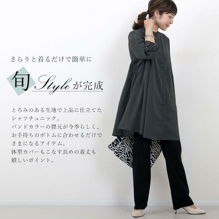 大人ワードローブの定番アイテム、バンドカラーシャツを滑らかなとろみツイル生地で仕立てぐっと上品な印象に。気になる体型をすっぽりとカバーしてくれるゆったりとしたチュニックシルエットに、背中にあしらったシャーリングデザインがポイント。シャーリングから後ろ裾に向かってドレープを描き、着こなしに女性らしい華やぎ感もプラスしてくれます。フロントを開けて羽織りとしても、またニットなどのインナーとしても使え、一枚あればコーデの幅がぐっと広がるアイテムです。
