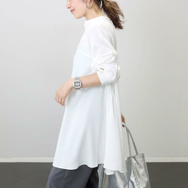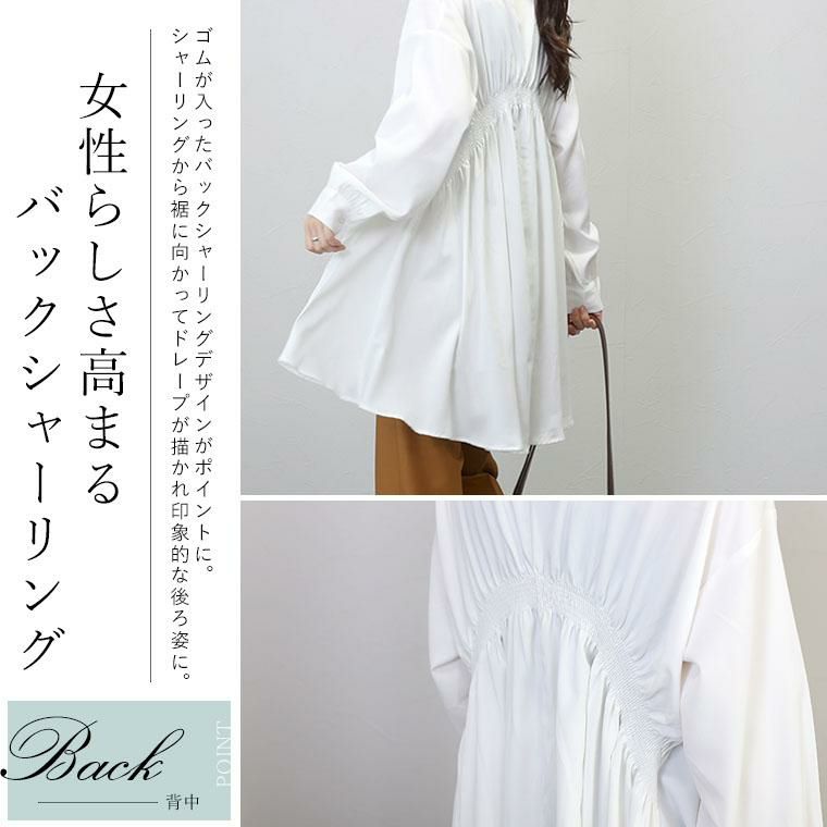 とろみ素材で上品に ドレープで華やぐバックシャンなシャツチュニック