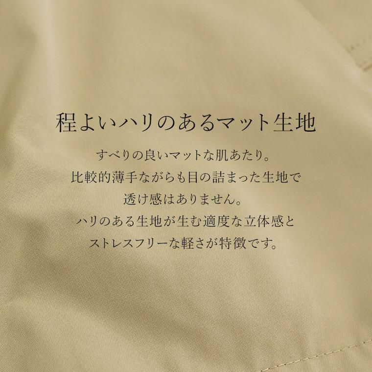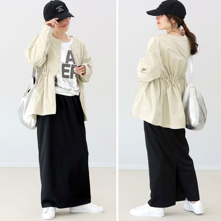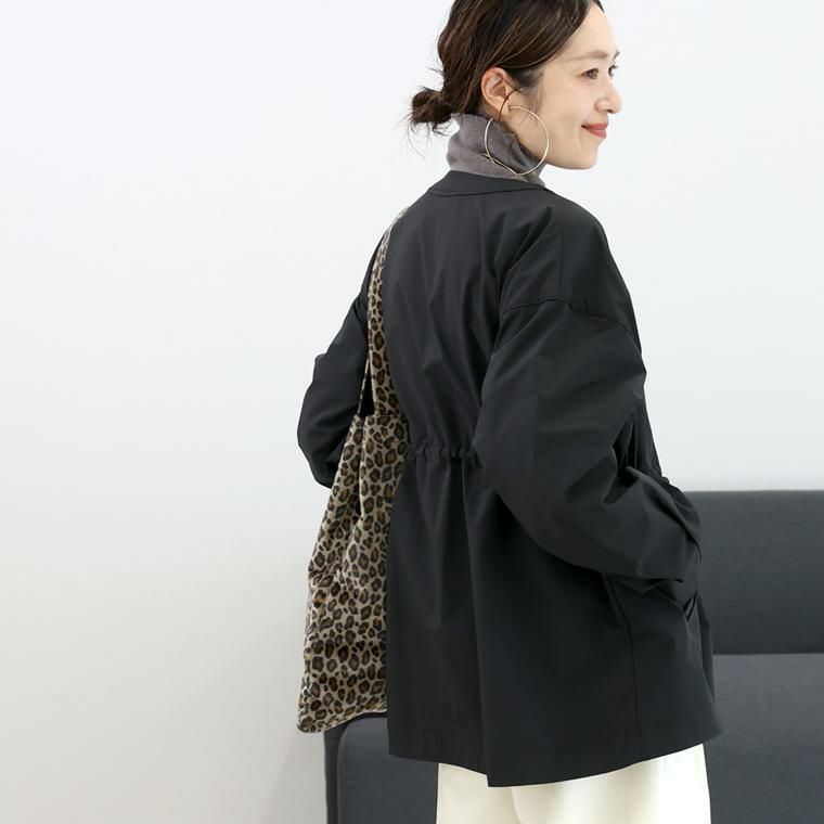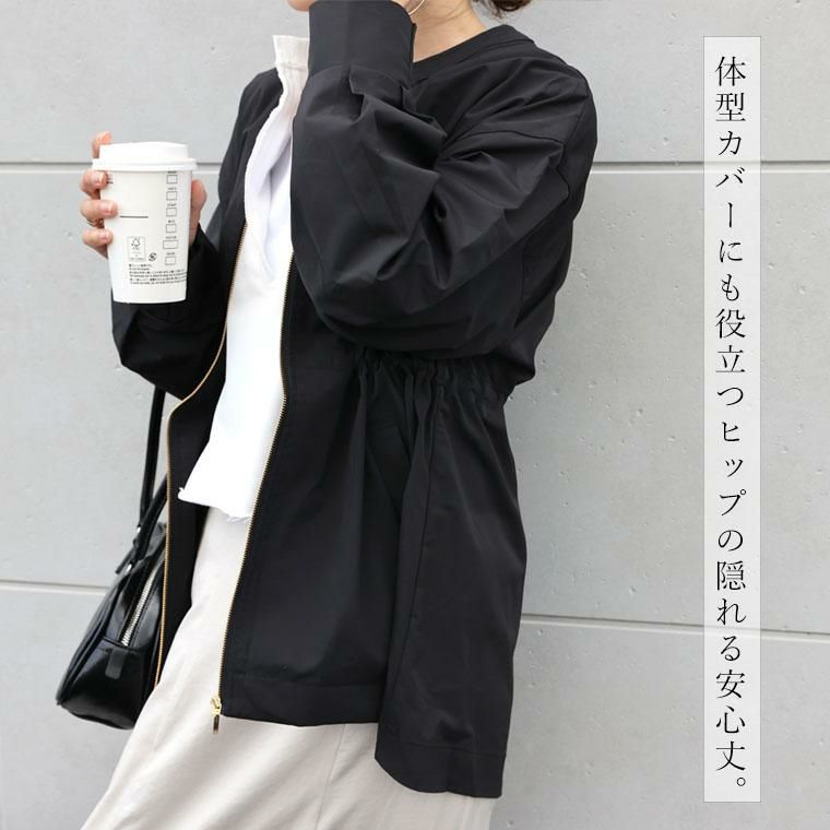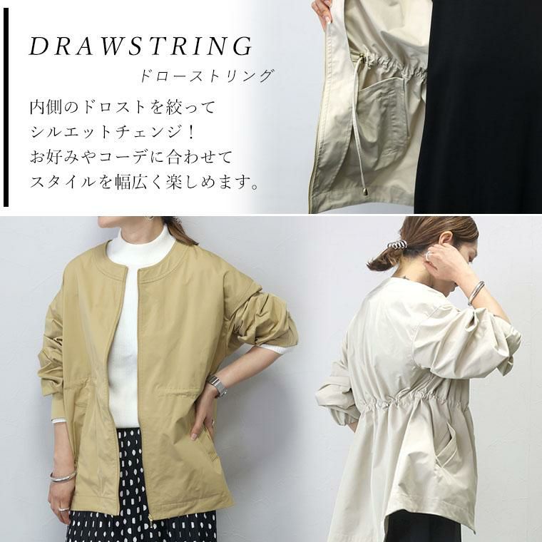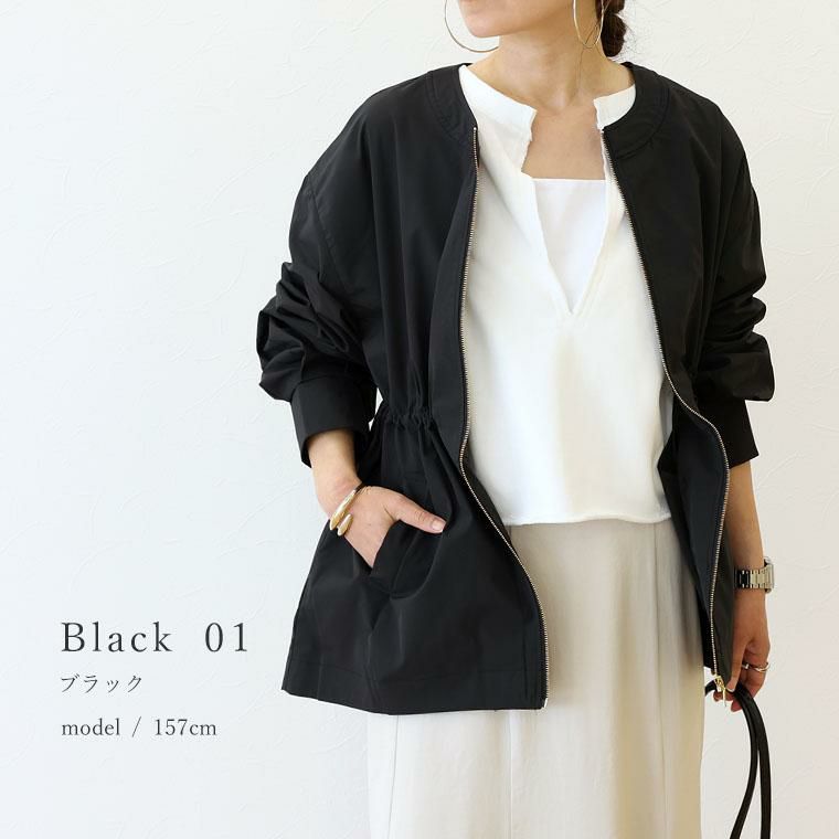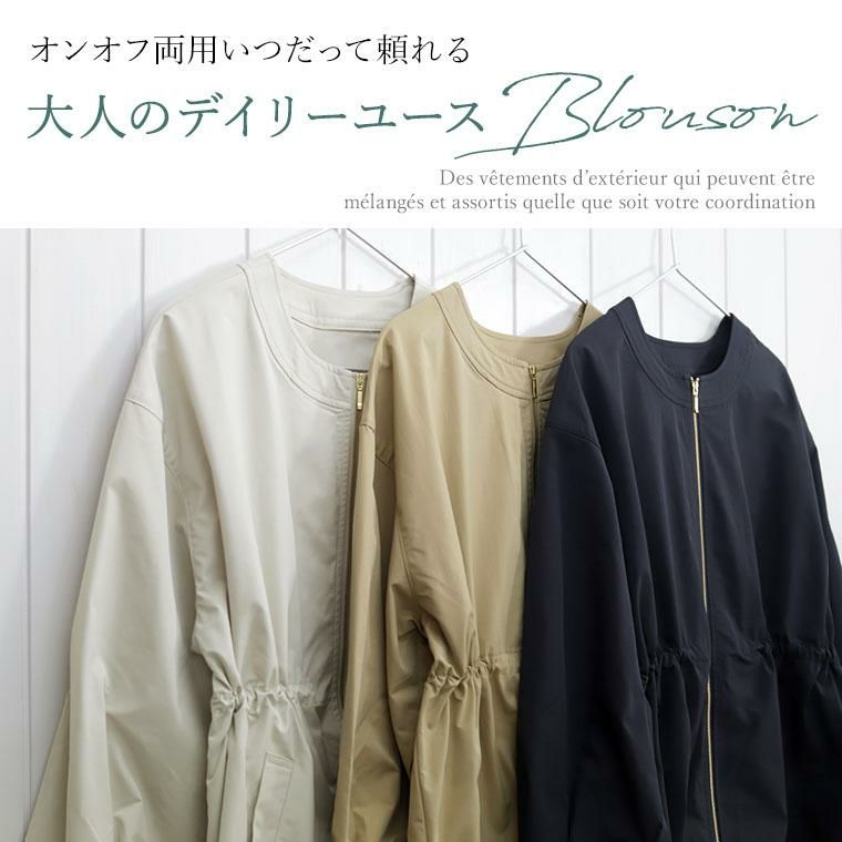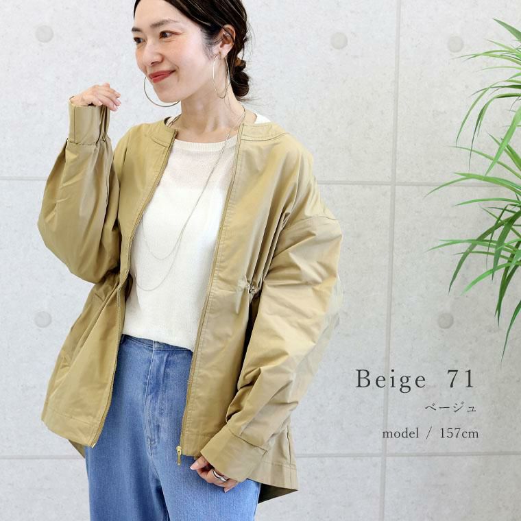 さっと羽織れてデイリーの着回しに重宝するライトアウター。程よいハリのあるマットな生地で、適度な立体感とストレスフリーな軽さが特徴です。ウエストの内側にはドローストリングが施されており、きゅっと絞ることでシルエットのアレンジが可能。合わせるアイテムや好みに応じて着方を楽しむことができ、背の高い方から小柄な方までバランスよく着られます。襟元は抜け感のある開き具合にこだわったノーカラー。ステッチの切替が女性らしいアクセントになっています。しっかり長めの着丈で実用性に優れ、腰・ヒップまわりの体型カバーにも役立ちます。オンオフ活躍する万能ブルゾンです。