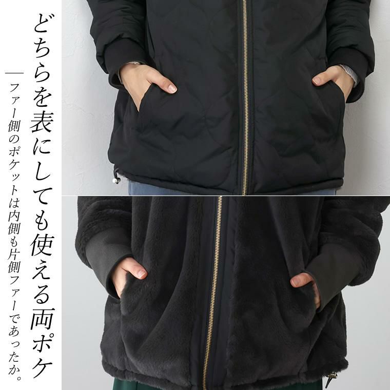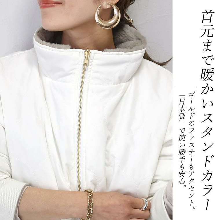 ファー×キルティングリバーシブルブルゾン キルティングブルゾン、ファーブルゾンの両方が1着で楽しめる リバーシブル仕様の優秀アウター。冬のお出掛けにマストな2種類のアウターを 気分に合わせてスタイルチェンジ。抜群の着回し力が自慢です。カジュアルに なりがちな中綿も、曲線キルトで大人に似合う上品な印象にクラスアップ。 ほどよいスポーティーさが洗練ムードを高めます。密度の濃さにこだわった フェイクファーはとても柔らかで肌触り抜群。思わず手の甲で撫でたくなるなめらかさです。 襟はスタンドカラーで首元までしっかり暖か。裾にはドロストをあしらい、ドロストを 絞ることで丸みのあるコクーンにシルエットチェンジ。 素材もシルエットも変えられる今季おすすめのアウターです。