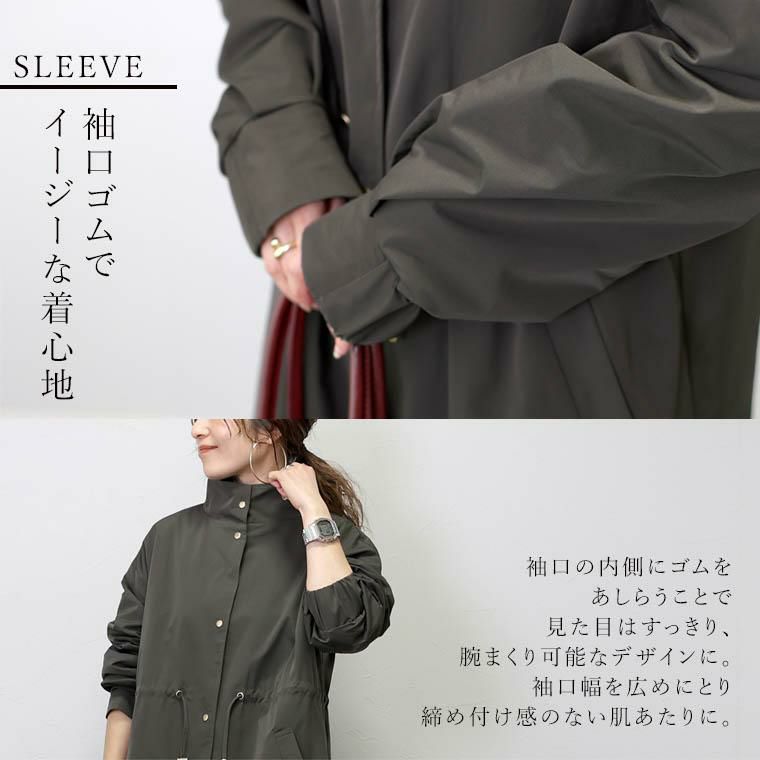 スイッチシーズンに活躍するライトアウター。程よいハリのあるマットな生地で、適度な立体感とストレスフリーな軽さが特徴です。薄手ながらも目の詰まった生地に裏地もついているので透け感を気にせず着用いただけます。襟元は旬のスタンドカラー。窮屈さを感じさせない高さにこだわりました。膝下までしっかり隠れるロング丈で体型カバーにもおすすめ。さらにウエストのドロストでシルエットのアレンジが可能。そのまますとんと着るのはもちろん、ドロストを絞ってギャザーを作れば女性らしさが高まりスタイルアップ効果も。ゴールドのパーツ使いもアクセントになっています。さっと羽織るだけでこなれ感がぐっと増す、コーデの主役になるライトアウターです。