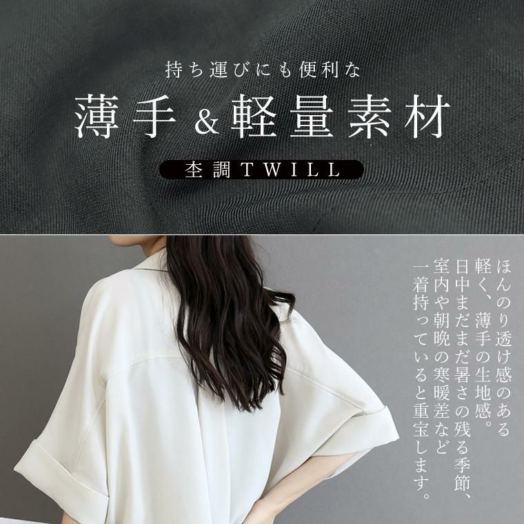 人気の杢調ツイル生地で仕立てた半袖のドルマンジャケット。さらっと羽織れる軽い着心地、しかもきちんと感もあってシワになりづらいのが特徴です。薄手でほんのり透け感があるので夏の羽織りに最適。柔らかくほどよいとろみのある風合いで、きちんと見えするダブルジャケットもかしこまり過ぎずデイリーユースにぴったり。襟はやや広めで女性らしさを強調。前合わせを深めのV開きにすることで顔まわりをすっきりみせてくれます。人気のドルマンシャツデザインをそのままジャケットに落とし込んだ良い所取りシルエットで、インナーも幅広く選べます。マットなスコッチボタンがアクセントになっており、開けても閉じても格好よく着られます。便利なポケットつき。内側の目に留まりやすい箇所の縫い目はパイピング仕様で上質感のある仕上がりに。トレンド不問、多シーンで着まわせるおすすめのライトアウターです。
