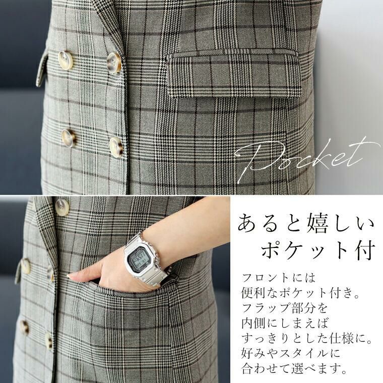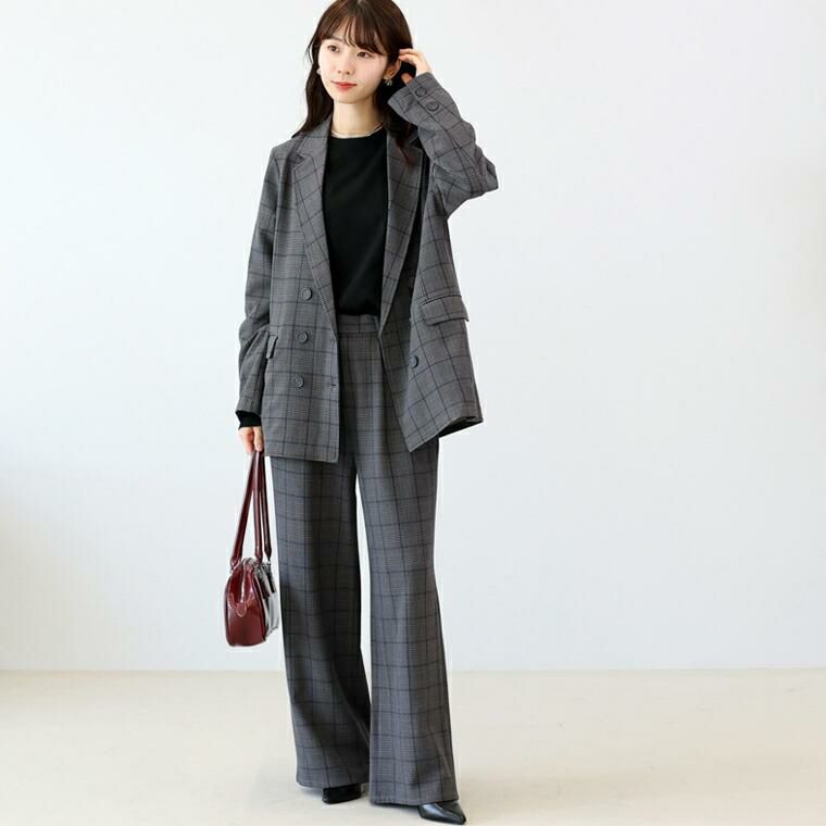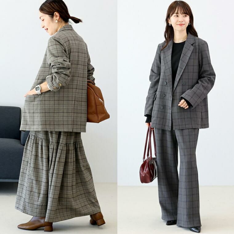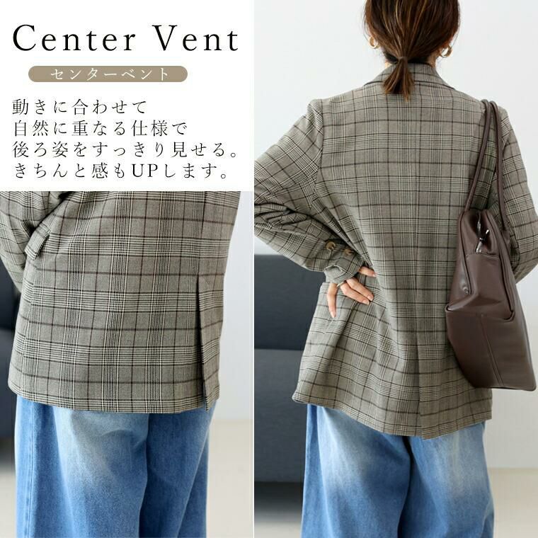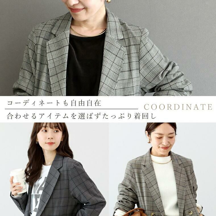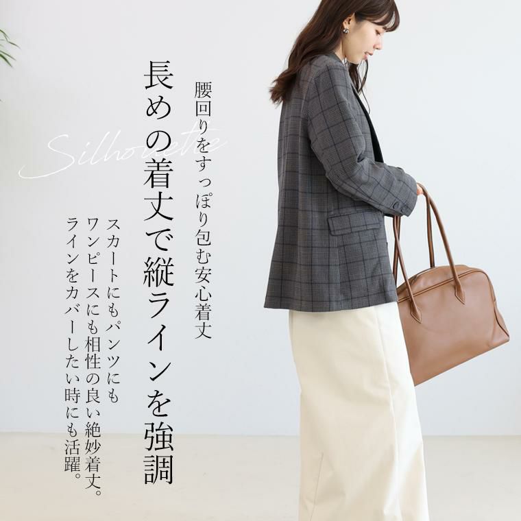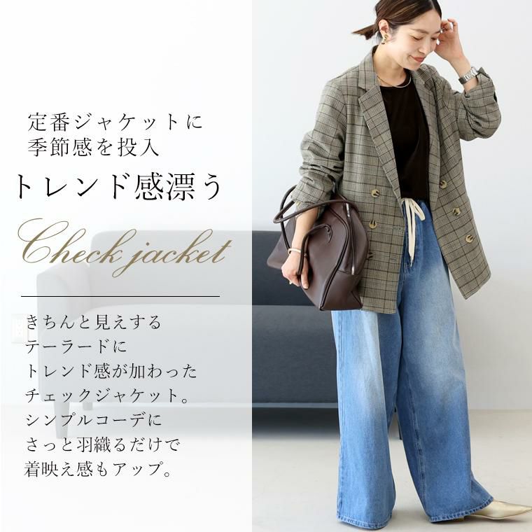 きちんと見えするテーラードジャケットにトレンド感が加わったチェックジャケット。襟はやや広めで女性らしさを強調。前合わせを深めのV開きにすることで顔周りをすっきり、インナーも幅広く選べます。シルエットはほどよくゆとりのあるダブルブレステッド。マットなスコッチボタンが品の良いアクセントになっており、前を開けても閉じても恰好良く着られます。着丈が長めなので、さっと羽織るだけで縦ラインを強調しスタイルアップ。腰まわりを隠してくれ、体型カバーにもおすすめです。マニッシュになりがちなチェックジャケットはスカートやワンピースとのコーデが好相性。お手持ちのアイテムが見違えます。