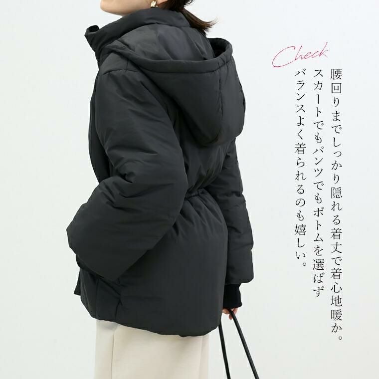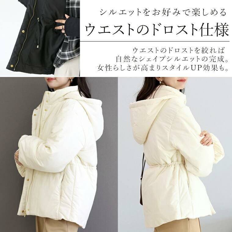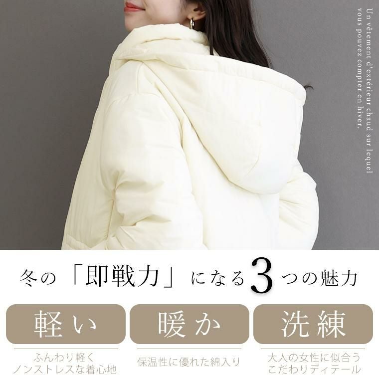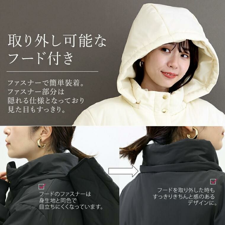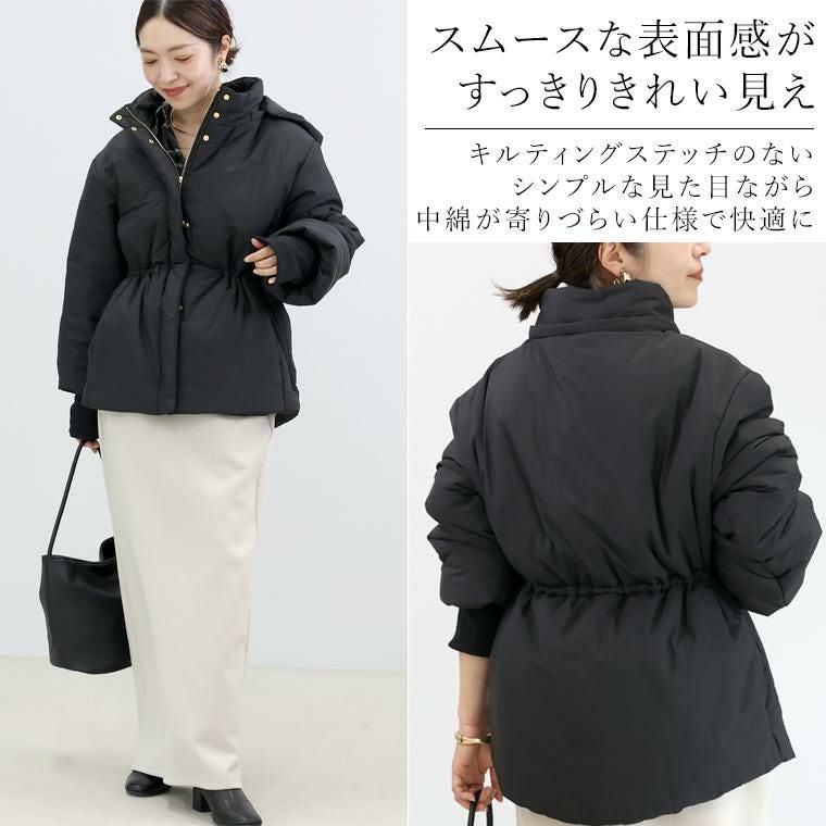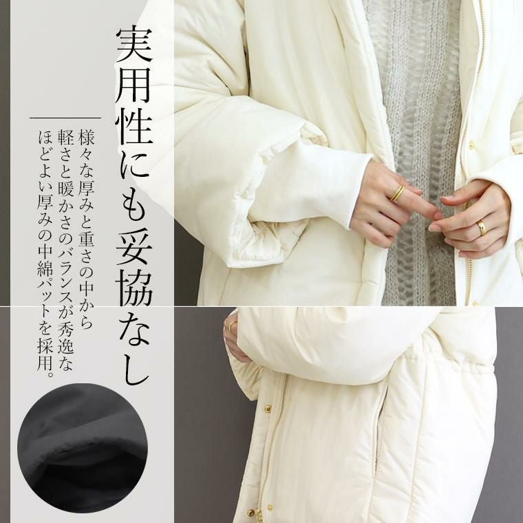 さっと羽織るだけで防寒も洒落見えも両得できる中綿コート。大人の女性に手に取っていただきたいディテールへのこだわりを詰め込みました。様々な厚みと重さの中から、軽さと暖かさのバランスが秀逸な程よい厚みの中綿パットを採用し、実用性にも妥協なし。表面生地はテカリを抑えたタフタで、ほんのりとしたシボ感が上品な印象です。ゆったりとしたシルエットでインナーにハイゲージニットを着ても余裕がある仕様。襟元はスタンドカラーで防寒性に優れ、小顔効果も。取り外し可能なフードも付いています。ウエストのドロストを絞れば自然なシェイプシルエットに。女性らしさが高まりスタイルアップ効果も期待。自宅での手洗いが可能で、クリーニング要らずのイージーケアも魅力です。トレンドに左右されない大人の女性の為のアウターです。