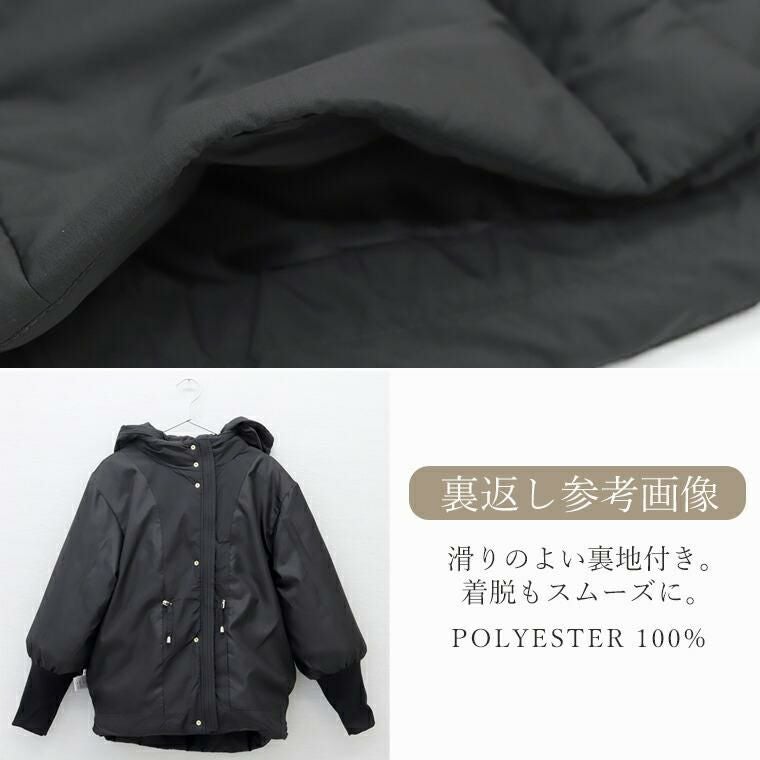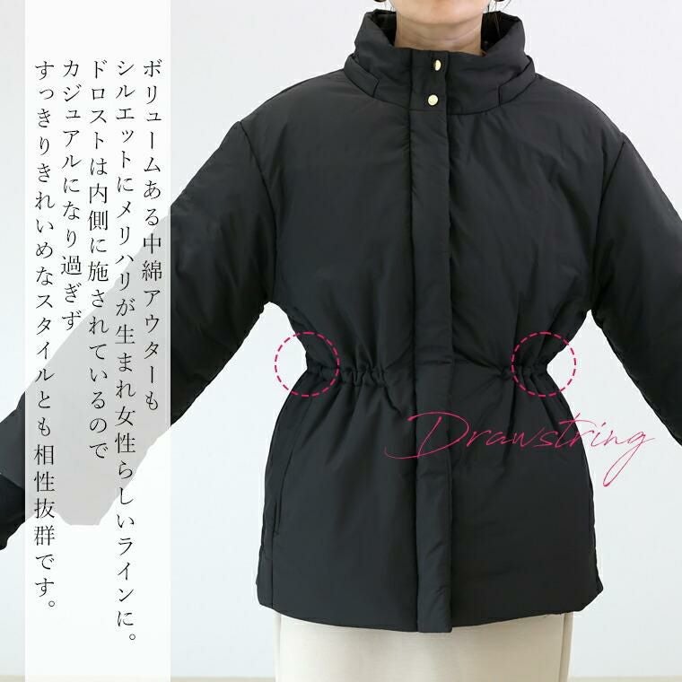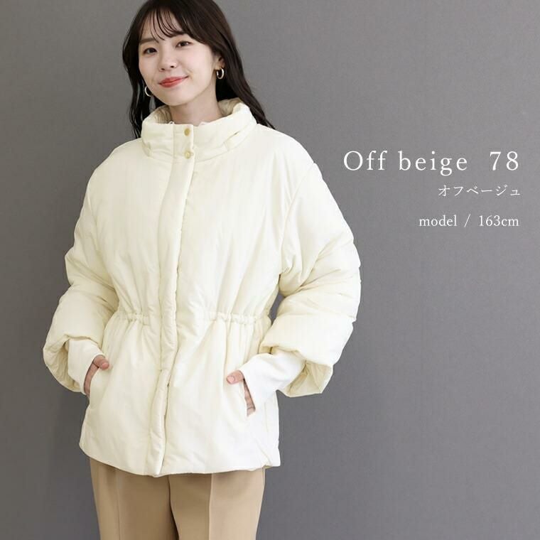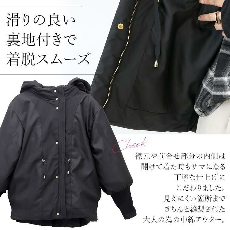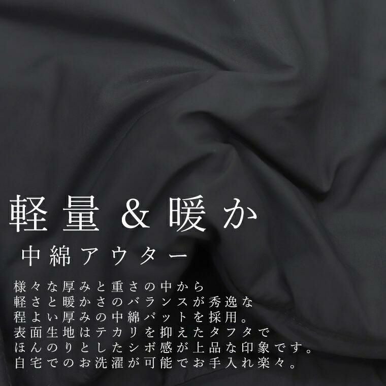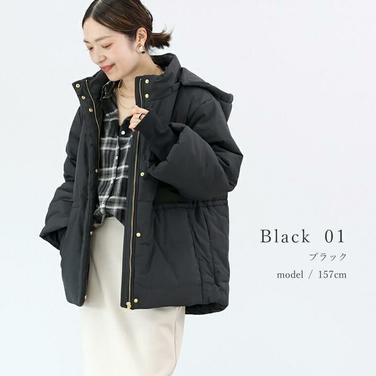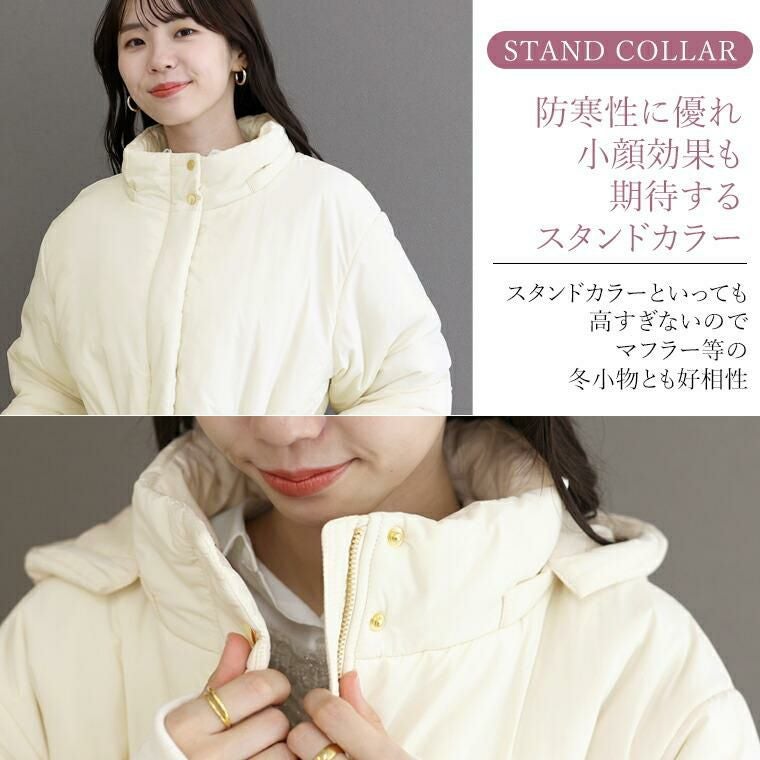 さっと羽織るだけで防寒も洒落見えも両得できる中綿コート。大人の女性に手に取っていただきたいディテールへのこだわりを詰め込みました。様々な厚みと重さの中から、軽さと暖かさのバランスが秀逸な程よい厚みの中綿パットを採用し、実用性にも妥協なし。表面生地はテカリを抑えたタフタで、ほんのりとしたシボ感が上品な印象です。ゆったりとしたシルエットでインナーにハイゲージニットを着ても余裕がある仕様。襟元はスタンドカラーで防寒性に優れ、小顔効果も。取り外し可能なフードも付いています。ウエストのドロストを絞れば自然なシェイプシルエットに。女性らしさが高まりスタイルアップ効果も期待。自宅での手洗いが可能で、クリーニング要らずのイージーケアも魅力です。トレンドに左右されない大人の女性の為のアウターです。