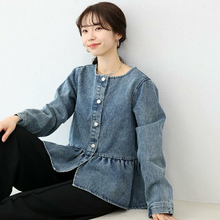 体型を包み込みながら、大人の可愛さを引き出すデニムのブラウスジャケットです。ペプラムシルエットで、腰回りをふんわり包み込む安心感。裾切替にたっぷりギャザーを寄せ、自然に広がるフレアラインが特徴。デニムでも重たく見えず、軽やかな印象。ノーカラーデザインで、顔まわりすっきり&上品に。甘さが出やすいペプラムも、デニム素材で程よくカジュアルダウン。襟裏のパイピング仕様で、脱いだ時・開けた時もきれいな印象です。刻印入りマットシルバーボタンが、大人らしいアクセントに。セットインスリーブで、肩のラインがきれいに出ます。甘カジュアルな雰囲気で、デニムなのに女性らしい印象。腰位置から広がる設計で、気になるお腹・腰・ヒップを自然にカバー。シンプルなボトムでも、コーデが完成します。デニムなのに、きれいめにも使えるアイテムです。