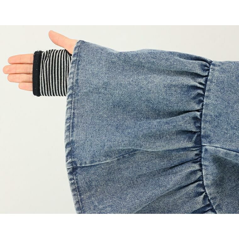 着丈はヒップの上くらい。袖丈は手首から5cm下。袖が短めです。身幅にあまりゆとりがなく生地も少し硬めなので着脱がしづらかったです。デニムのジャケットですがあまり重さは感じませんでした。