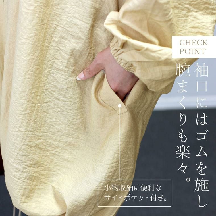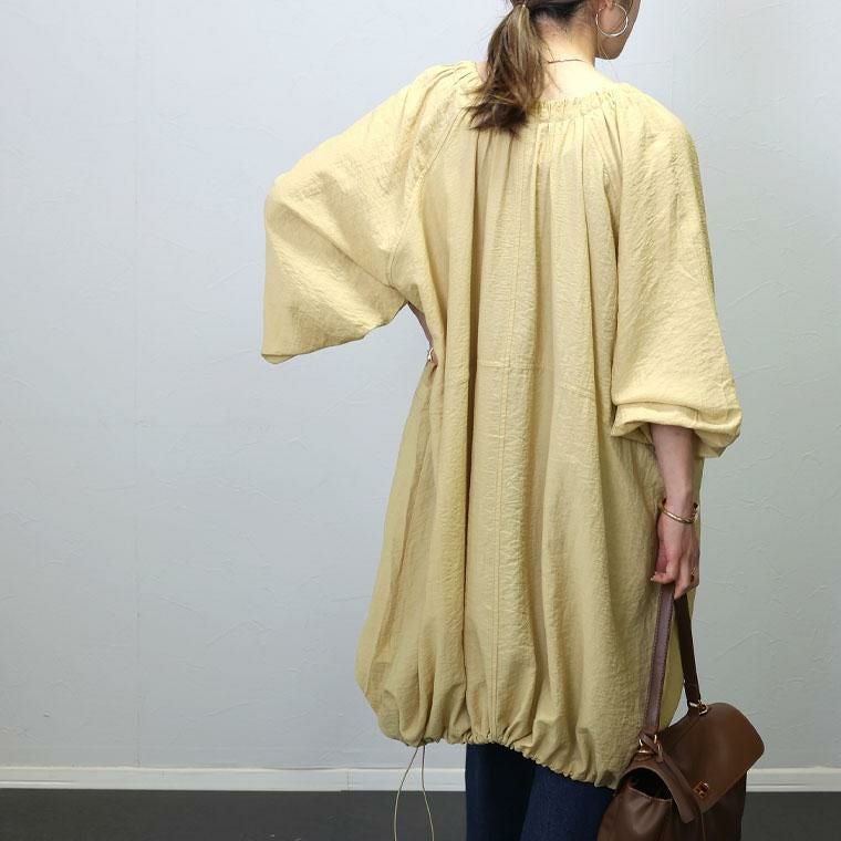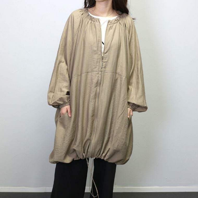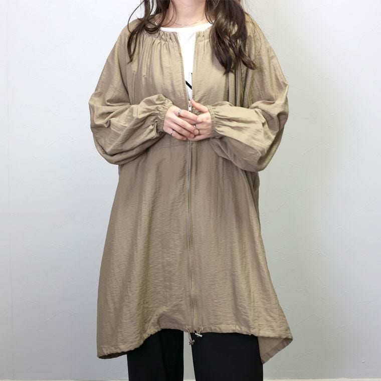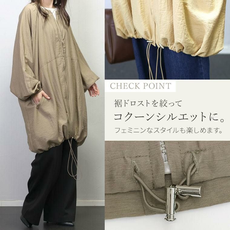 軽量で着心地の良いリネンライクのライトアウター。シワ加工を施した薄手素材で扱いやすい素材です。襟元、袖、裾にたっぷりギャザーをあしらったフォルムが女性らしい印象。袖口にはゴムを施して腕まくりしやすいデザインです。裾にはドロストをあしらい、コクーンシルエットにも変更可能。たっぷり身幅をとったゆったりシルエットとすっきりとしたノーカラーが絶妙なバランスです。合わせるアイテムを選ばない、季節の変わりめに便利なミドル丈のアウターです。