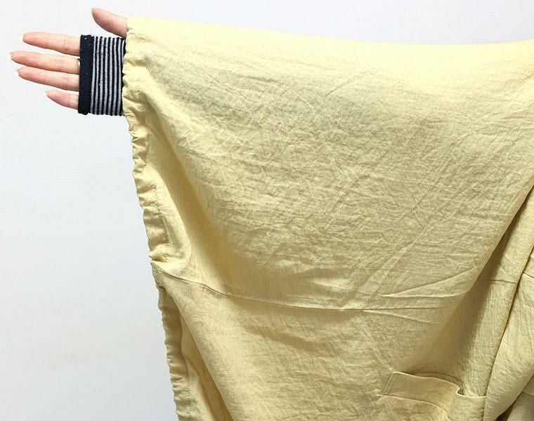 着丈は膝の上くらい。袖丈は手首から12cm下。全体的にかなりゆったりしたサイズ感で中に着るものを選ばず着れそうです。程よくハリがあり体のラインを拾わず◎。袖口はゴムで腕まくりをすると軽く止まります。