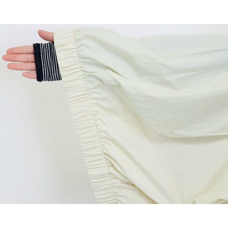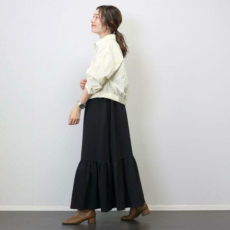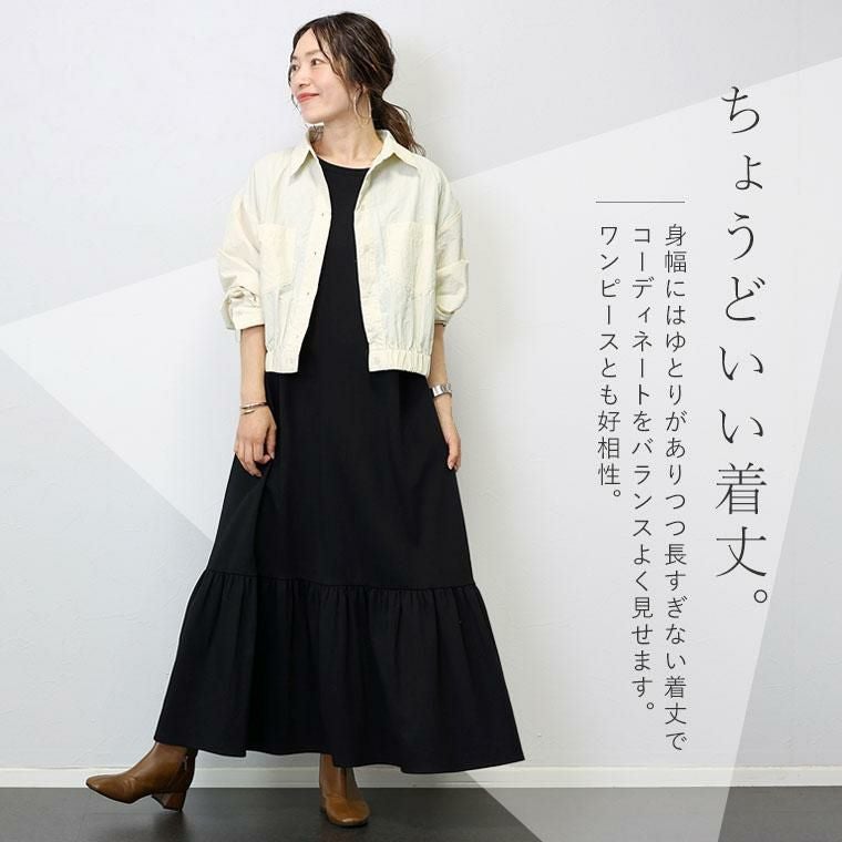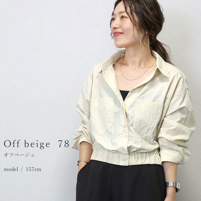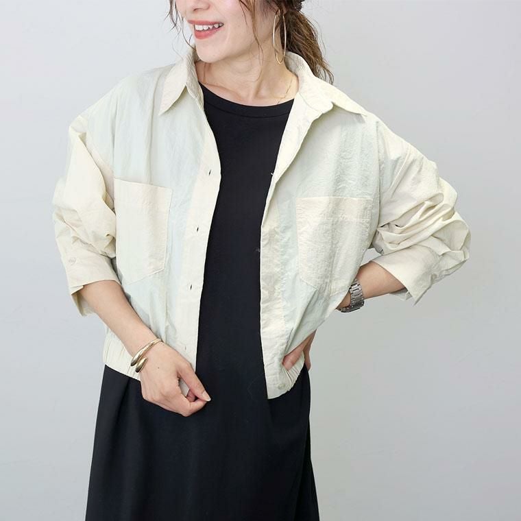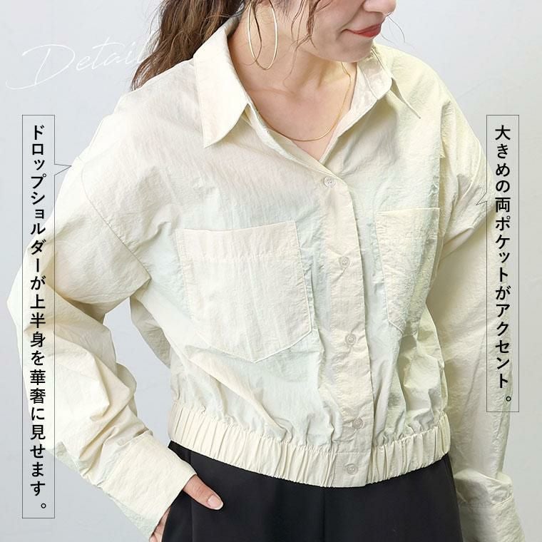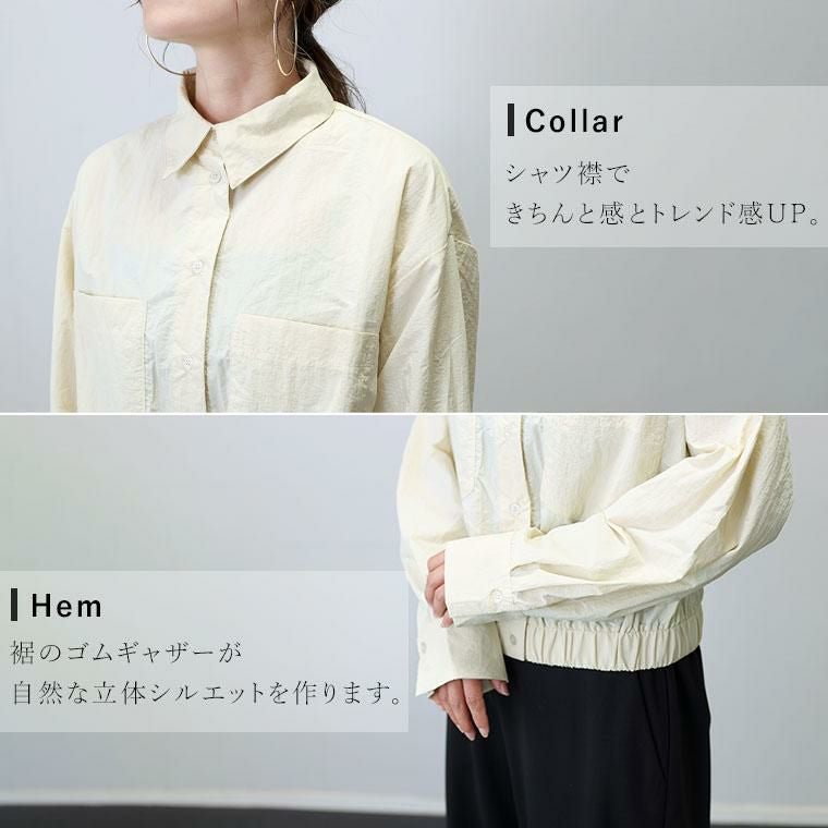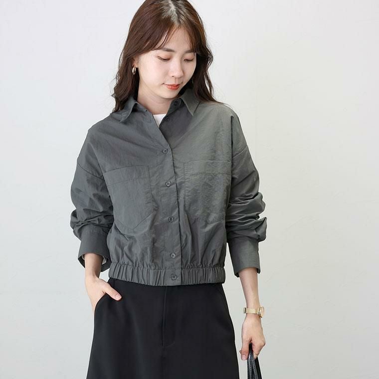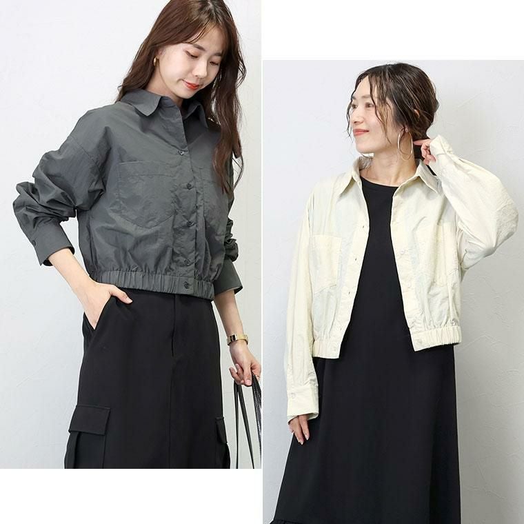 シャカシャカとした素材感が特徴のナイロンワッシャー素材。リンクル加工でシワを気にせず着られるのが魅力です。薄手なのでシャツ感覚で使えるのが便利。シャツ襟できちんと感とトレンド感アップ。ドロップショルダーが上半身を華奢に見せます。大きめの両ポケットがアクセント。上半身をコンパクトに見せてくれる視覚効果も嬉しい。裾のゴムギャザーが自然な立体シルエットを作ります。身幅にはゆとりがありつつ、長すぎない着丈でコーディネートをバランスよく見せます。ワンピースとも好相性。後ろヨーク切替とタックデザインでバックスタイルも手抜き感がありません。気温調節だけでなくトレンドも踏襲した、季節の変わり目に頼れるアイテムです。