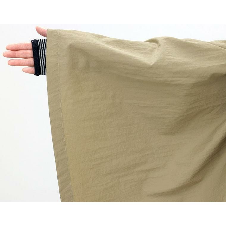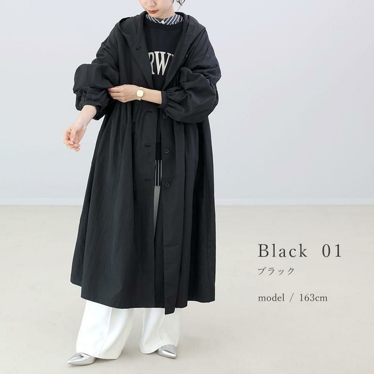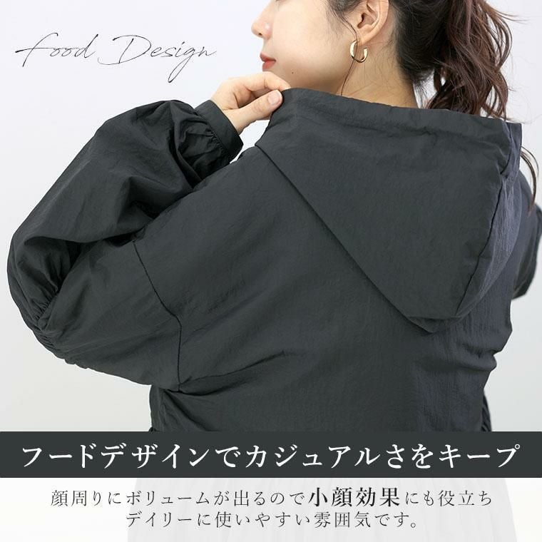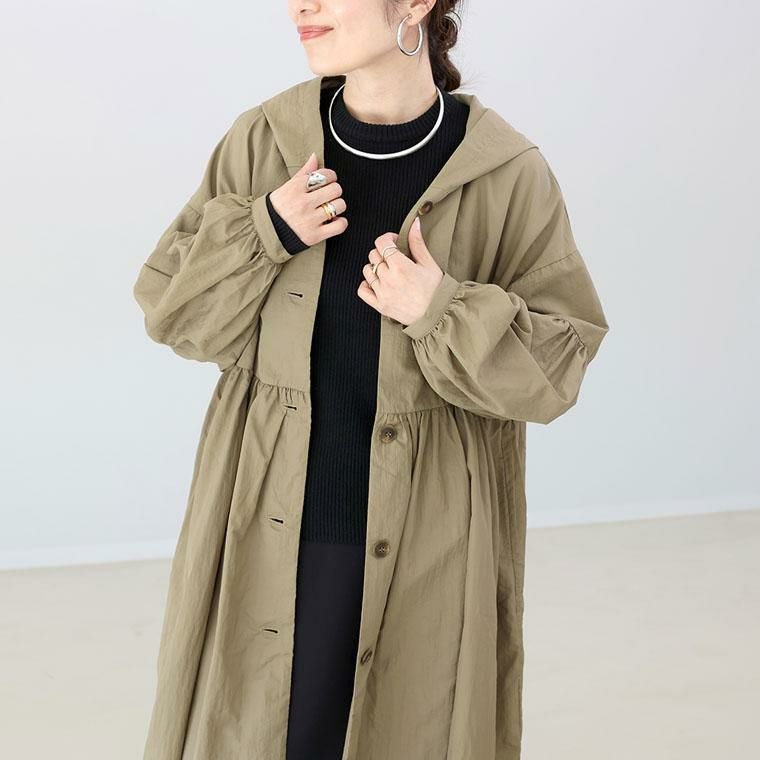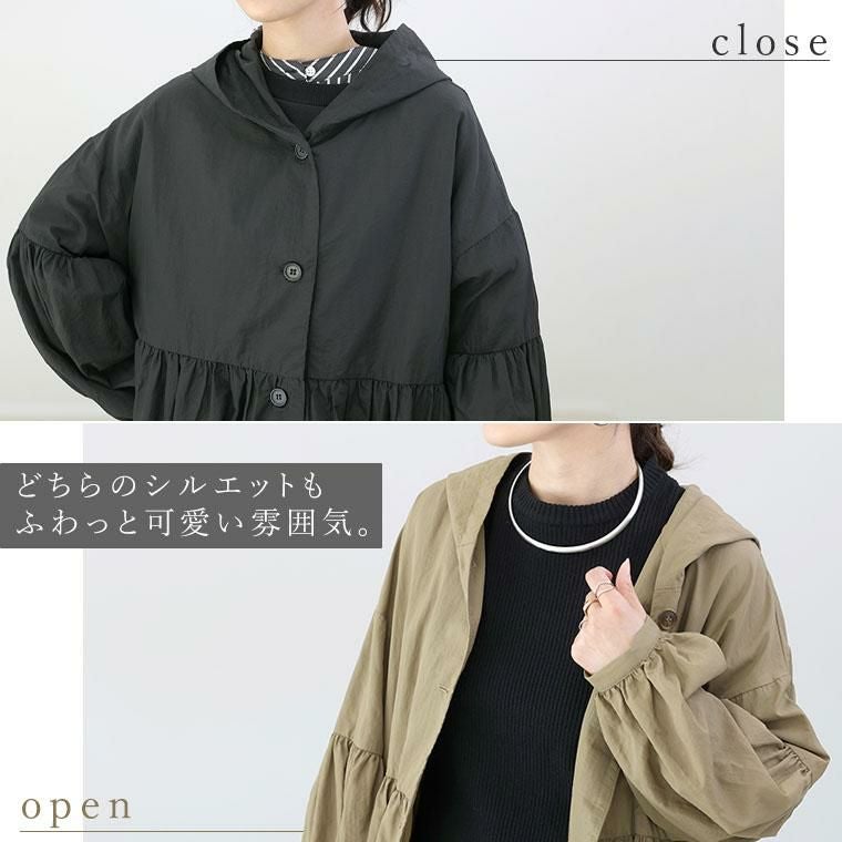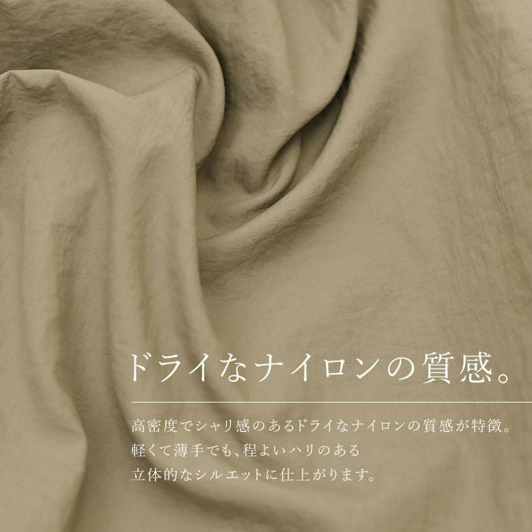 高密度でシャリ感のあるドライなナイロンの質感が特徴。軽くて薄手でも、程良いハリのある立体的なシルエットに仕上がります。たっぷりと長い着丈に、生地をふんだんに使用したギャザーから流れるドレープで縦のラインを強調。すらりとした印象です。身頃の前後にあしらったギャザーが女性らしさを醸し出し、ボディーラインをすっぽりカバーします。袖の切替にも細かくギャザーを寄せてぽわんとした立体スリーブが愛らしい。フードデザインでカジュアルさもキープ。顔周りにボリュームが出るので小顔効果にも役立ち、デイリーに使いやすい雰囲気です。トレンド不問で役立つ合服ライトアウターです。