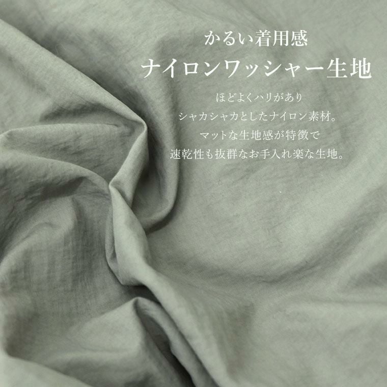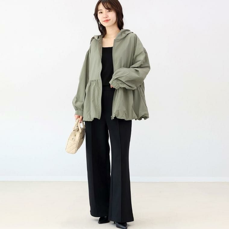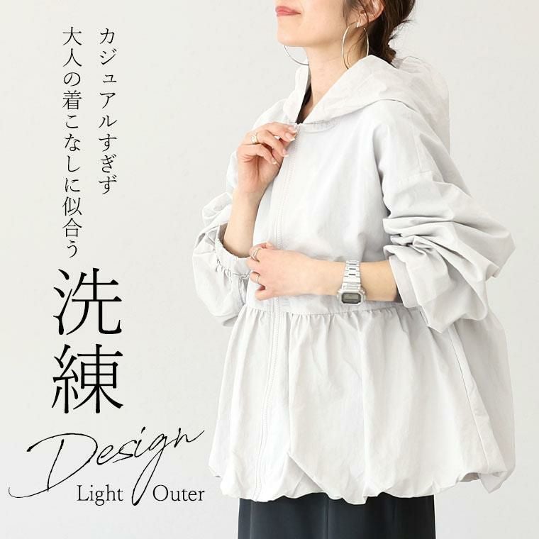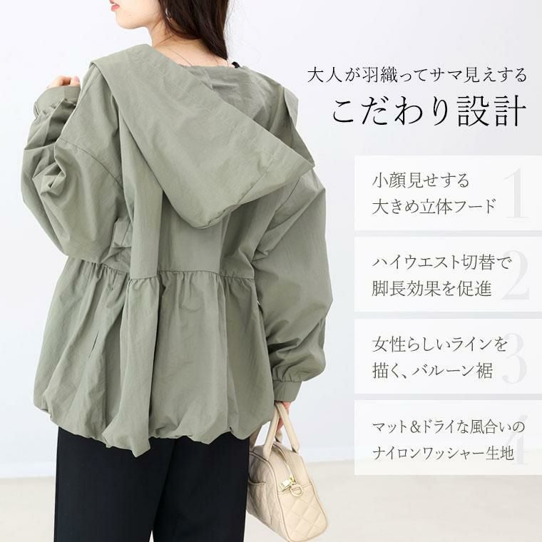 羽織るだけでサマになる大人のパーカー付きライトアウター。生地には軽くてドライタッチなナイロンワッシャーを採用。シボ感ある風合いが魅力で日常使いやレジャーなどマルチに活躍します。大きなフードで小顔効果を促進、ハイウエスト切替と裾バルーンシルエットが立体的なシルエットを描きます。デザイン性高く、カジュアルすぎない洗練された印象で、大人の着こなしにぴったりなアウターです。