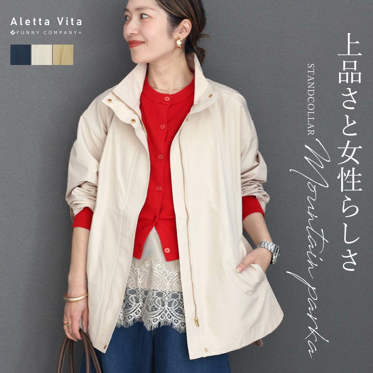 他の画像を見る 上品さと女性らしさを備えたスタンドカラーきれいめマウンテンパーカー スタンドカラーT/Cピーチサイドボタンマウンテンパーカー 【メール便不可】 ¥ 7,260 税込 販売期間 2026/02/12 14:30 〜 2027/12/31 23:59 カートに入れる お気に入りに登録する